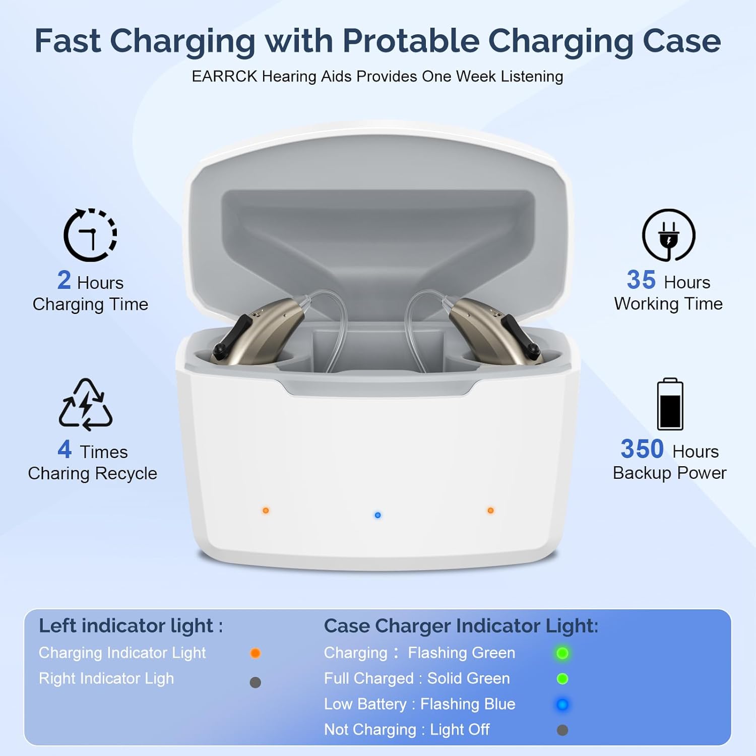[High Capacity Battery Case]: Fully charged within 2 hours and the hearing aids can be used for more than 10 hours without bluetooth connection. there will be 80 hours back up power in the base for charging hearing aids about 4 times. The chargers with over charging protection circuit so you don’t need to worry about overcharging. in addition, you can monitor device battery capacity from APP. You don’t worry about hearing aids run out of power suddenly result in impacting your daily any more.