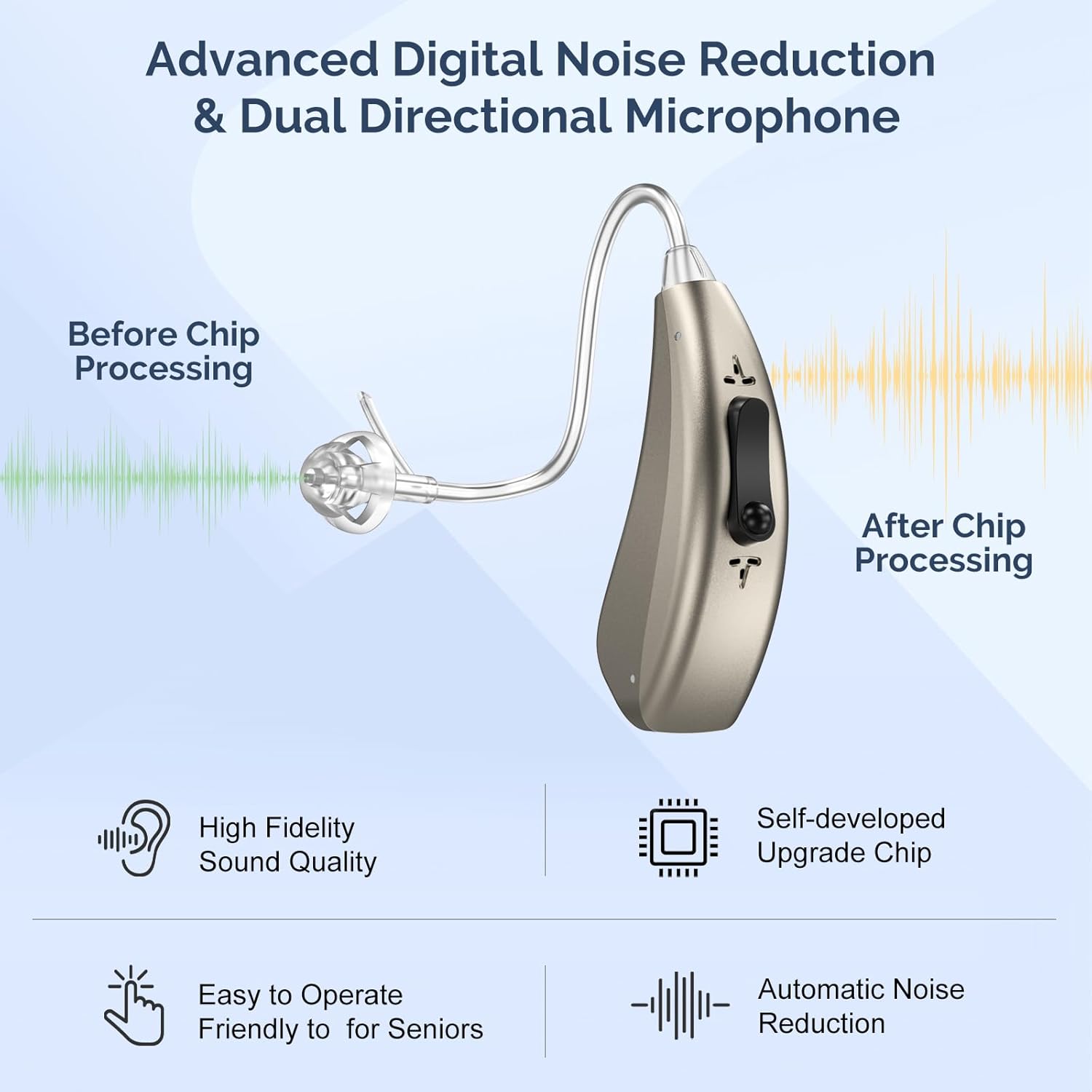 [Hearing Aids with Noise Reduction] :Earrck hearing aids comes with built-in intelligent chip and dual micphone own the function of multi-directional noise reduction . The smart chip divides sounds to different channel frequencies which improving processing, noise cancellation, feedback suppression and background noise removal significantly .it can help ensure that the hearing aid delivers quality sound and speech intelligibility. so you can focus on your conversation without any distractions.