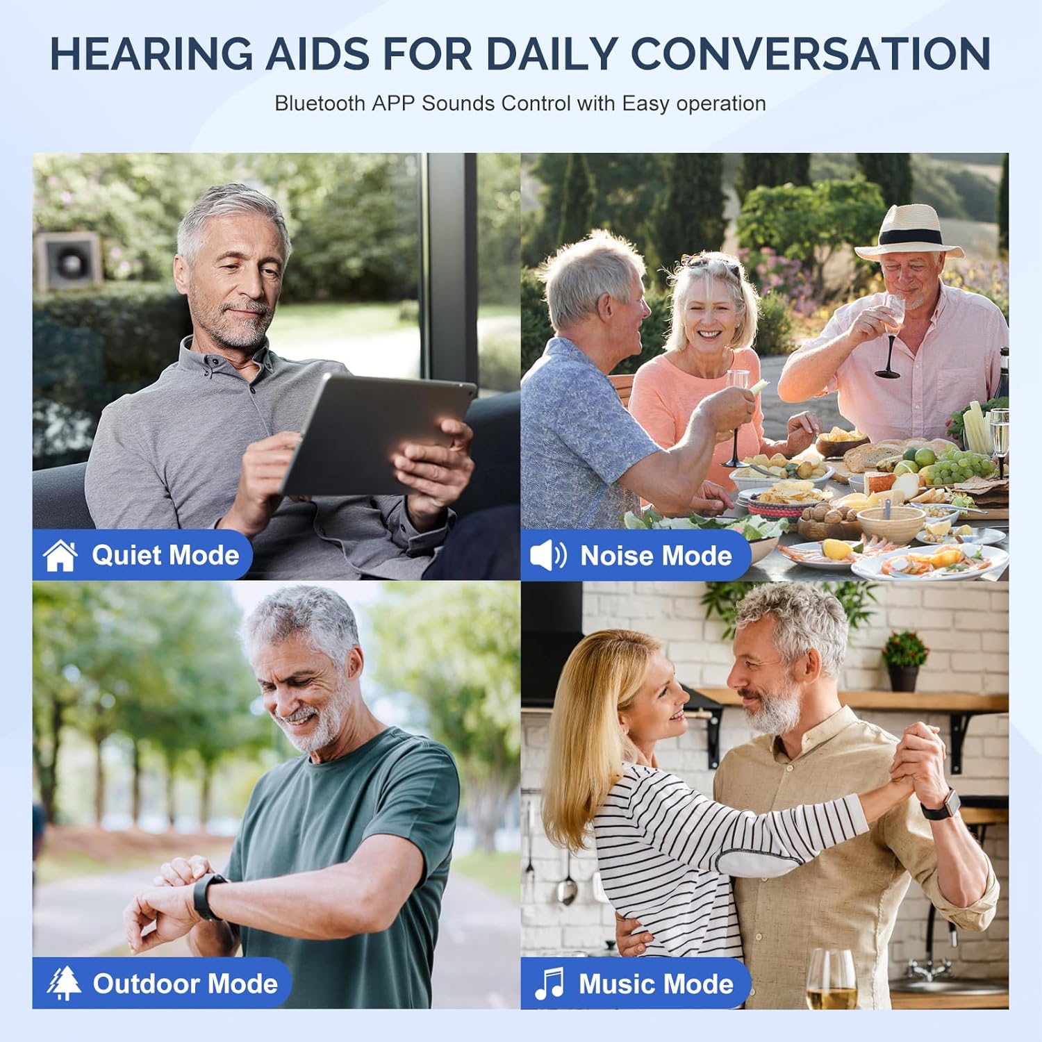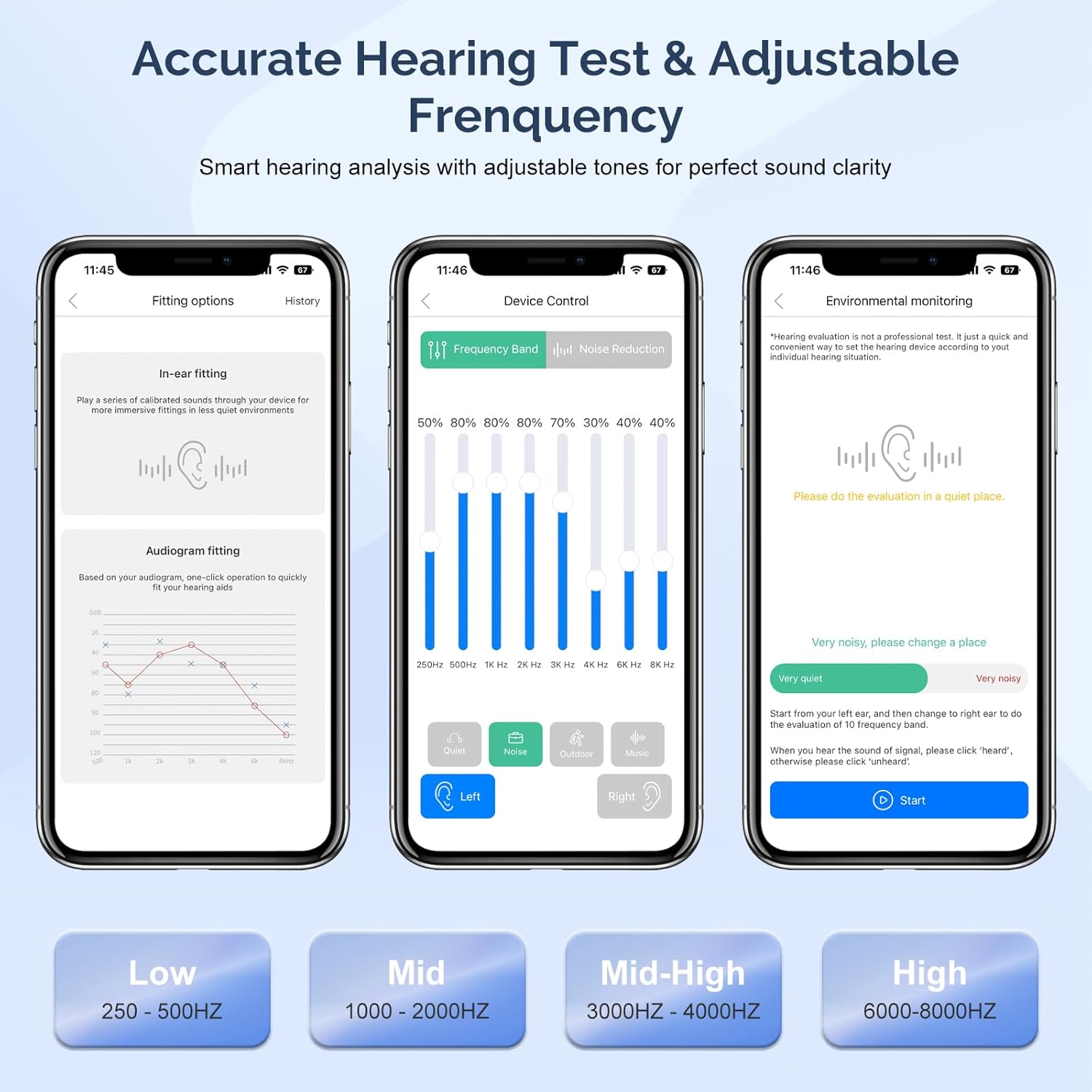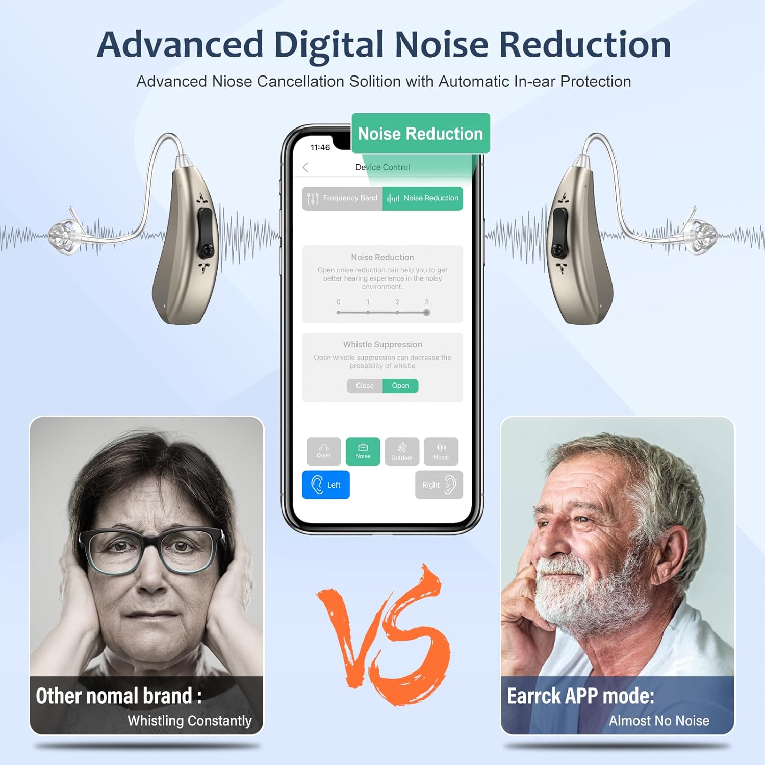 [Bluetooth Hearing Aids with Smart APP Control]: Earrck Hearing Aids connect directly to smartphones via Bluetooth, enabling effortless sound adjustments, program changes, and frequency tuning (250Hz-8000Hz) through physical buttons or our intuitive app – ideal for seniors seeking simplified control. *To ensure full app functionality, please verify your phone runs Android 8.0+ or iOS 12.0+ before purchasing.