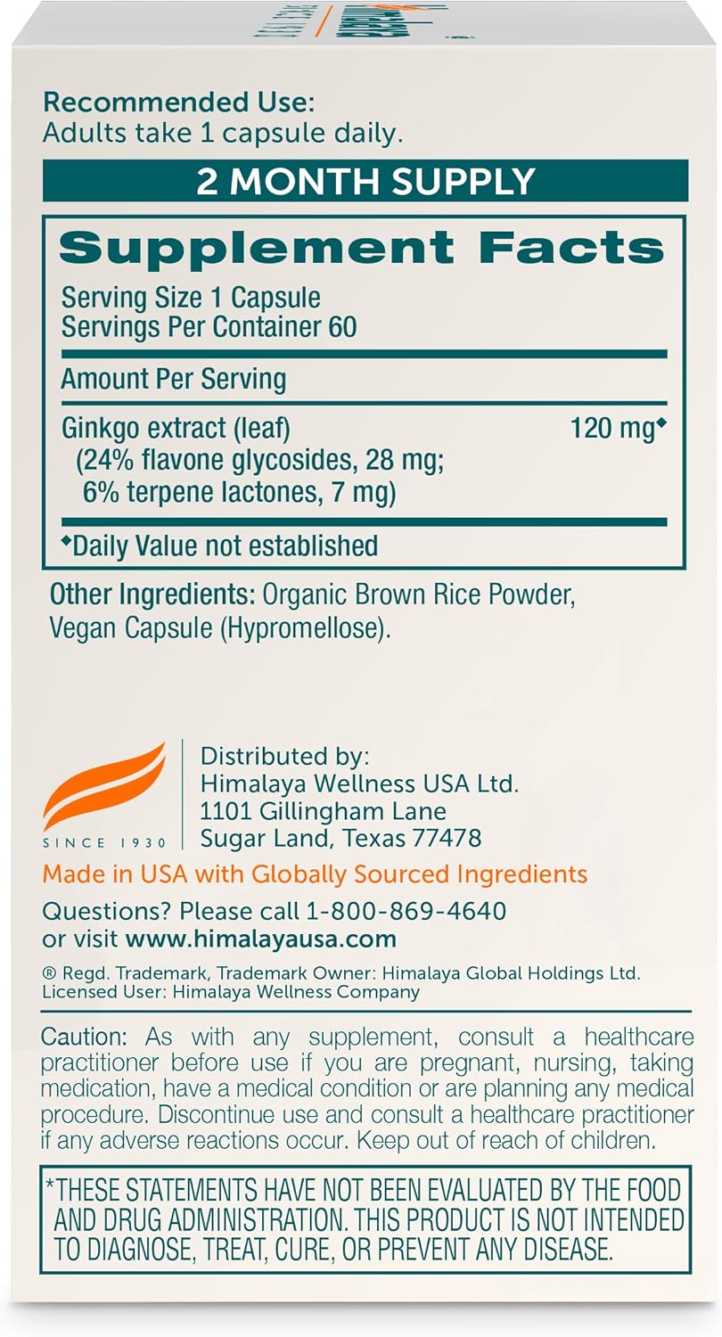 Himalaya Ginkgo Biloba, Herbal Supplement for Memory & Mental Sharpness, Vegan, Gluten Free, 120 mg Ginkgo Leaf Extract, 60 Capsules