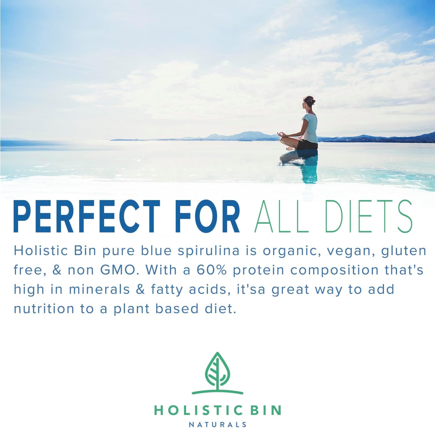 NUTRIENT-PACKED ORGANIC BLUE SPIRULINA POWDER Holistic Bin Blue Spirulina Powder is a rich source of plant-based protein, antioxidants, and phytonutrients. Grown and harvested in the USA, this organic blue-green algae powder is not only tasty but healthy.