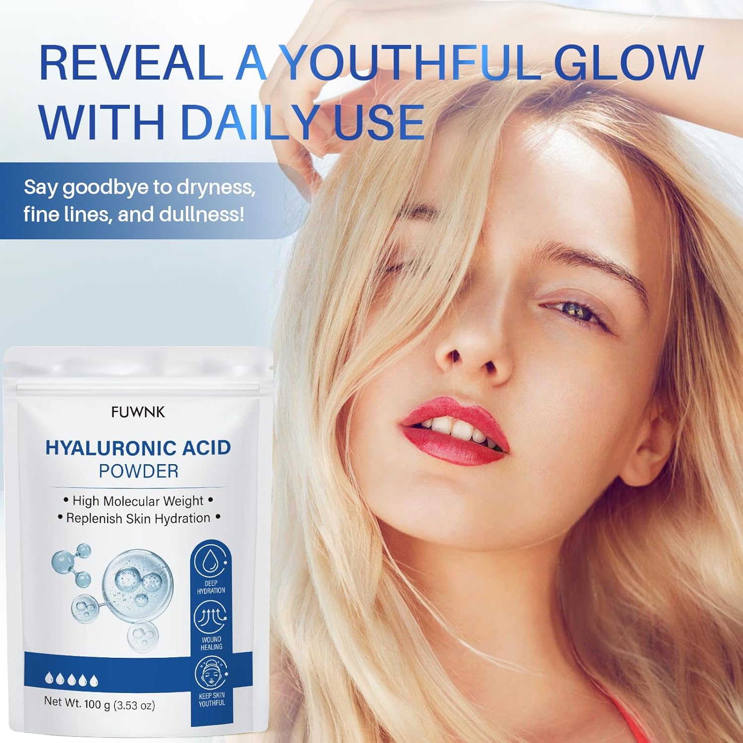 PREMIUM HYALURONIC ACID POWDER: Our hyaluronic acid powder for skin is made from pure sodium hyaluronate powder with a high molecular weight. It effectively moisturizes the skin and enhances elasticity for a smooth, youthful appearance.
