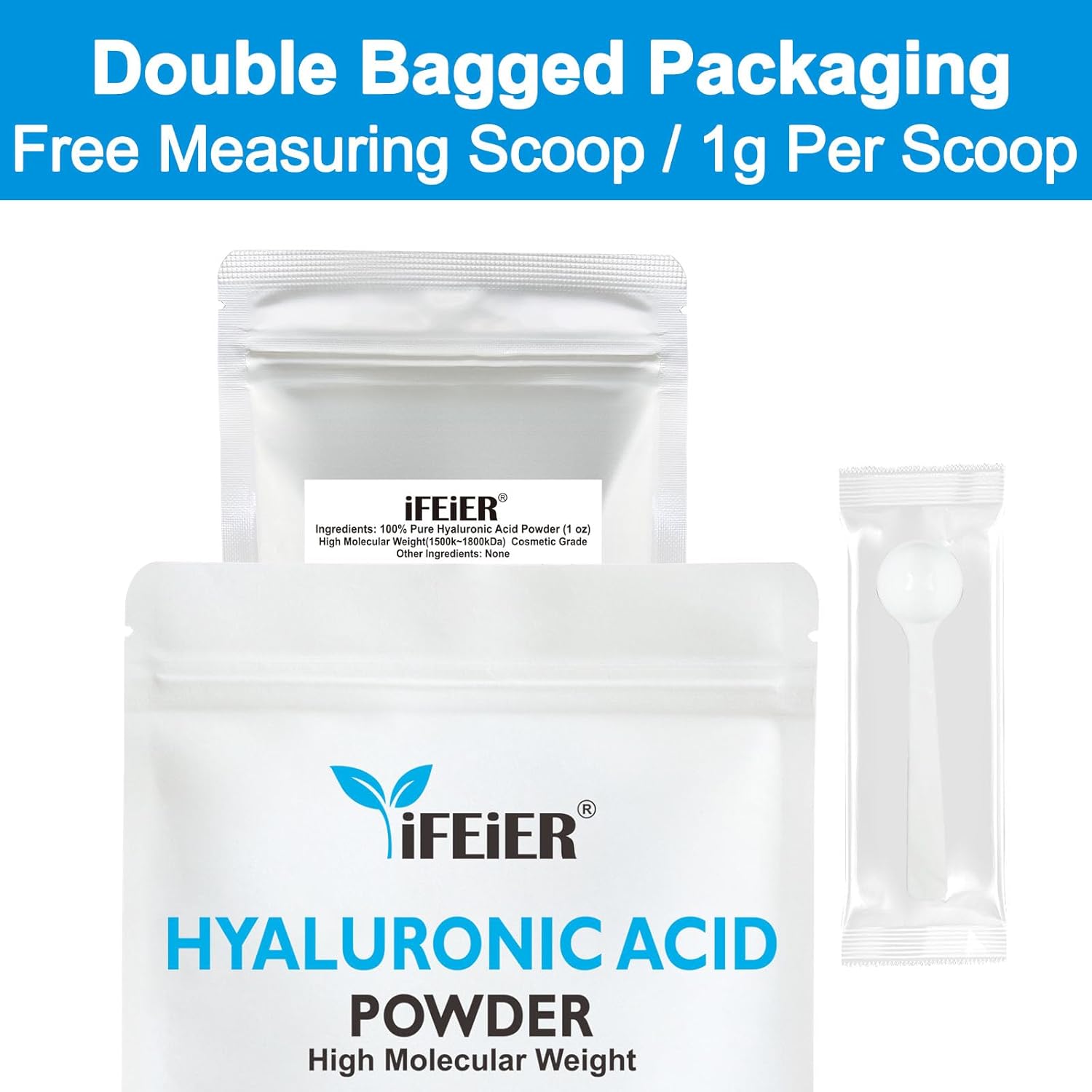 iFEiER High Molecular Weight Hyaluronic Acid Powder (1500k~1800kDa). Net Weight: 1oz (28.3g). Cosmetics Grade. It’s very easy to make a Hyaluronic Acid serum. Just add 1g of Hyaluronic Acid Powder to 100ml of water and wait for the solution to turn into a clear gel. 1g of powder can make 100ml (3.5oz) of serum, money saving!