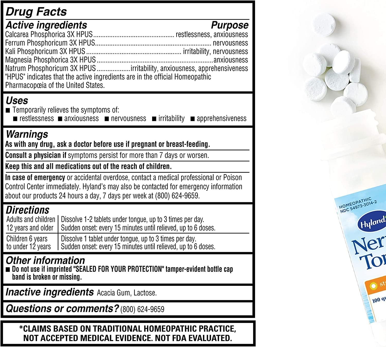 Hyland’s Nerve Tonic Stress Relief Tablets, Natural Relief of Stress, 50 Count, Temporarily relieves the symptoms of restlessness, anxiousness, nervousness, and irritability. NATURAL REMEDIES SINCE 1903. Hyland’s has been producing homeopathic remedies since 1903. Hyland’s products are made with natural ingredients, and contain no artificial flavors, dyes or parabens. This product works to stimulate the body’s own natural healing process. All of Hyland’s products are safe, effective and completely free of aspirin, acetaminophen or ibuprofen and have no contraindications with other medications.