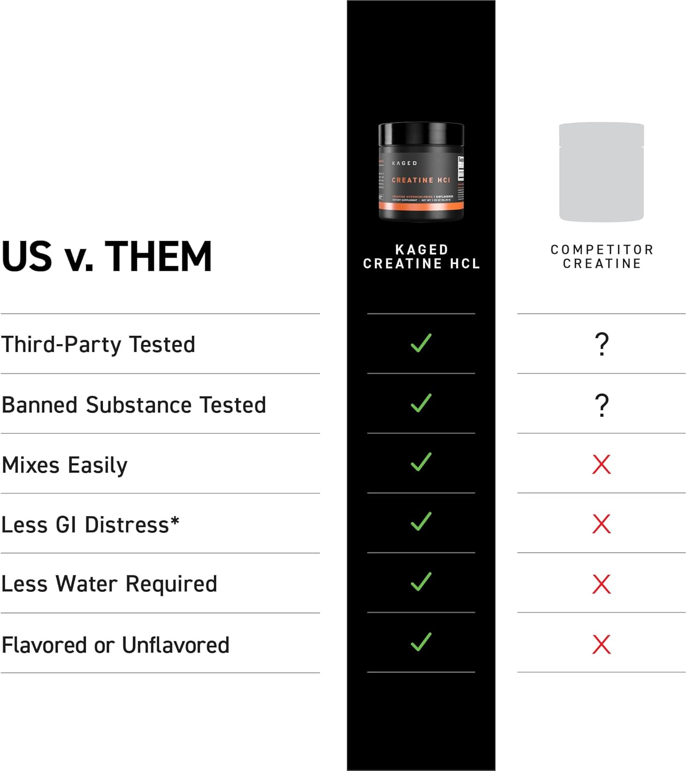 EXCLUSIVE, PATENTED & PREMIUM QUALITY: Creatine HCl delivers premium quality, and its patented form is exclusive to Kaged. There is simply no other creatine hydrochloride powder or creatine hydrochloride pills like it. While the proven & strength-building power of creatine monohydrate has been a staple for athletes for decades, creatine HCl has set a new standard for lifters who are looking for a high-solubility creatine solution for their training and supplementation plans.
