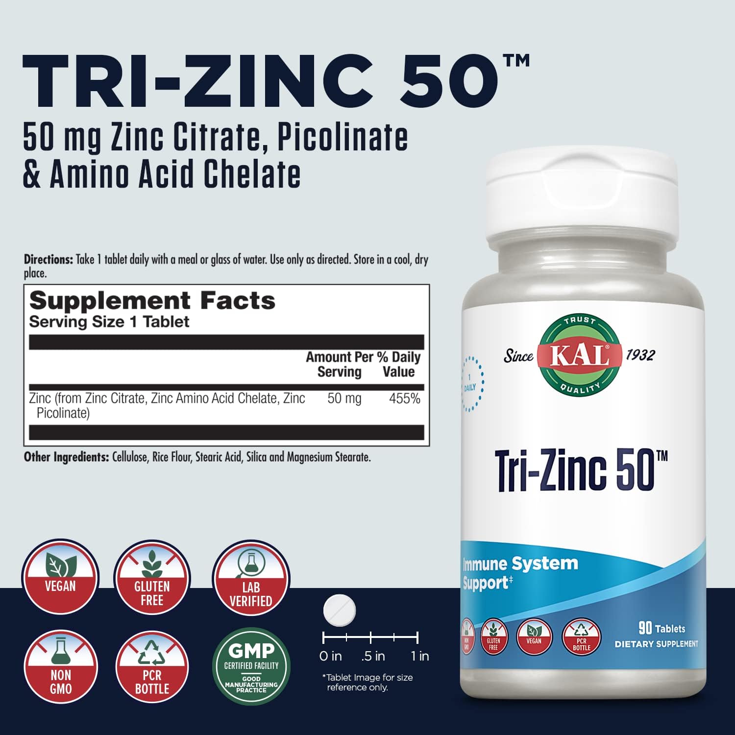 KAL Tri Zinc 50mg w/Zinc Citrate, Zinc Amino Acid Chelate and Zinc Picolinate, Healthy Metabolism and Immune Support Supplement, Vegan, Gluten Free, Non-GMO, 60-Day Guarantee, 90 Servings, 90 Tablets