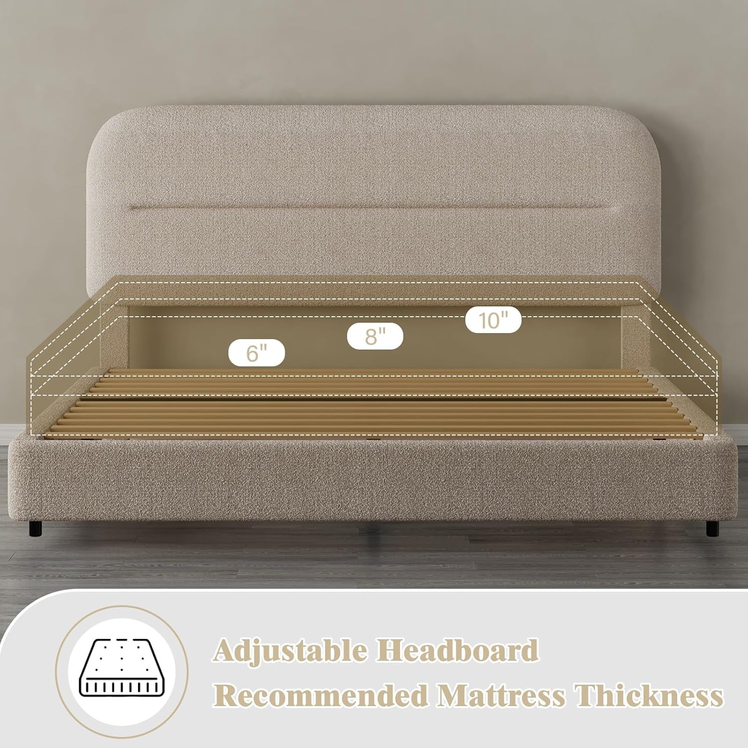 King Size Boucle Bed Frame, Upholstered Cloud Bed Frame with Headboard, Soft Platform Bed Frame with Thickened Footboard, Rounded Corners, No Box Spring Required, Easy Assembly, Beige