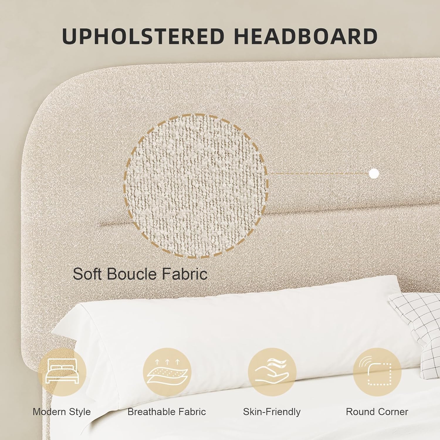 Curved Anti-collision Design: The headboard and footboard of this boucle bed frame king have a simple and smooth curved design, which is aesthetically pleasing and also reduces damage caused by daily collisions, making it more suitable for children and teenagers