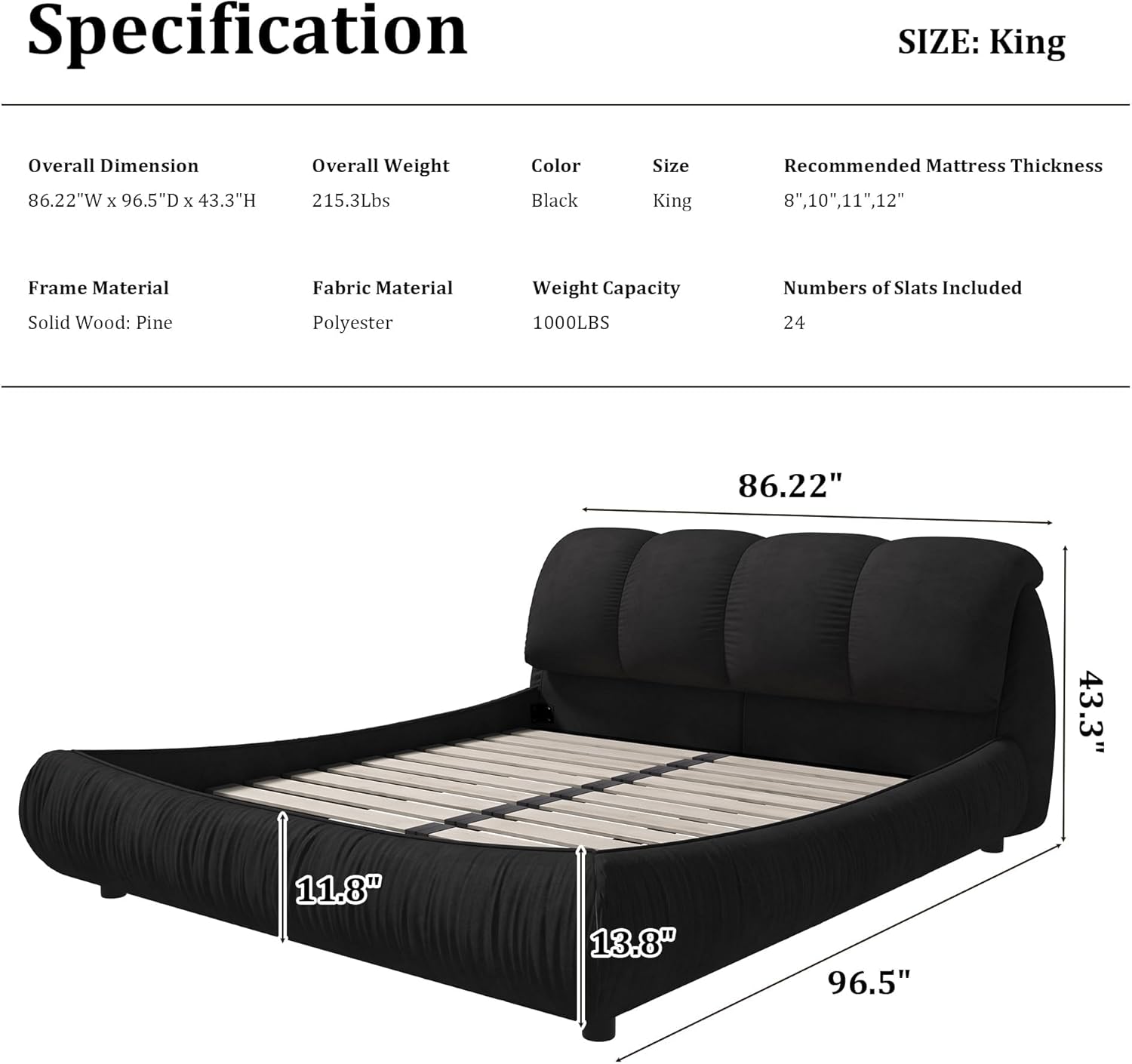King Bed Frame: This Luxury Upholstered Platform Bed features a solid wood frame, providing exceptional support and durability. The king size dimensions of 86.22″W x 96.5″D x 43.3″H ensure ample space for a comfortable night’s sleep.