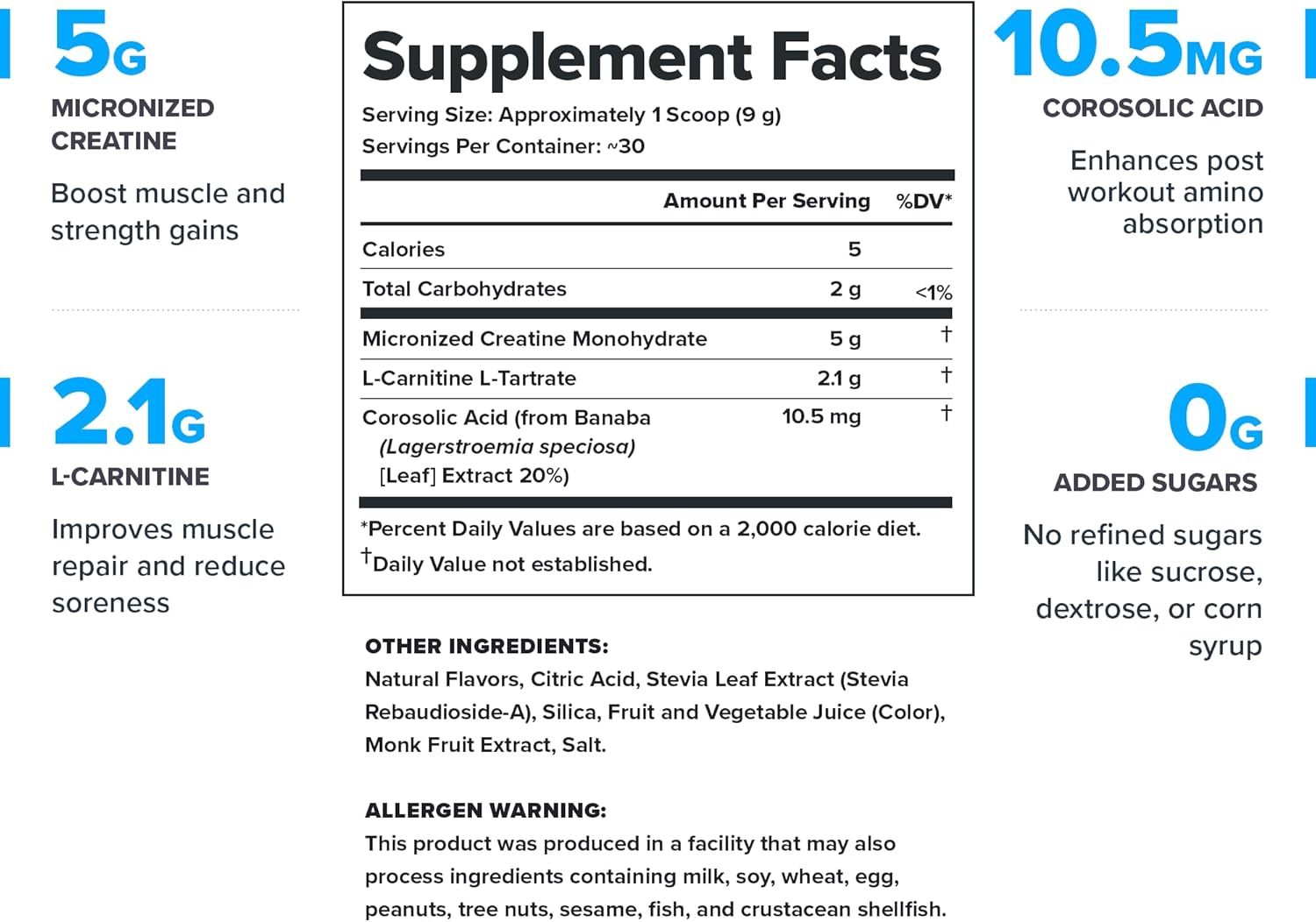 Clean creatine powder for men and women and transparent label that shows exactly what’s in every serving of our recovery drink and what’s not (no proprietary blends or hidden ingredients).