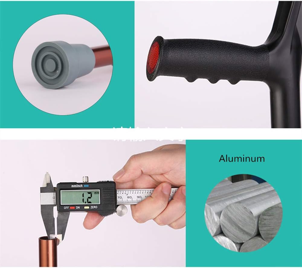 [Material] aluminum alloy main tube + rubber non-slip foot mat + environmental ABS plastic grip. High quality aluminum alloy: 1.2mm thick aluminum alloy tube, one crutch net weight is 0.44kg(0.97lb). Lightweight but sturdy. Safely supporting up to 100kg/220Ib.