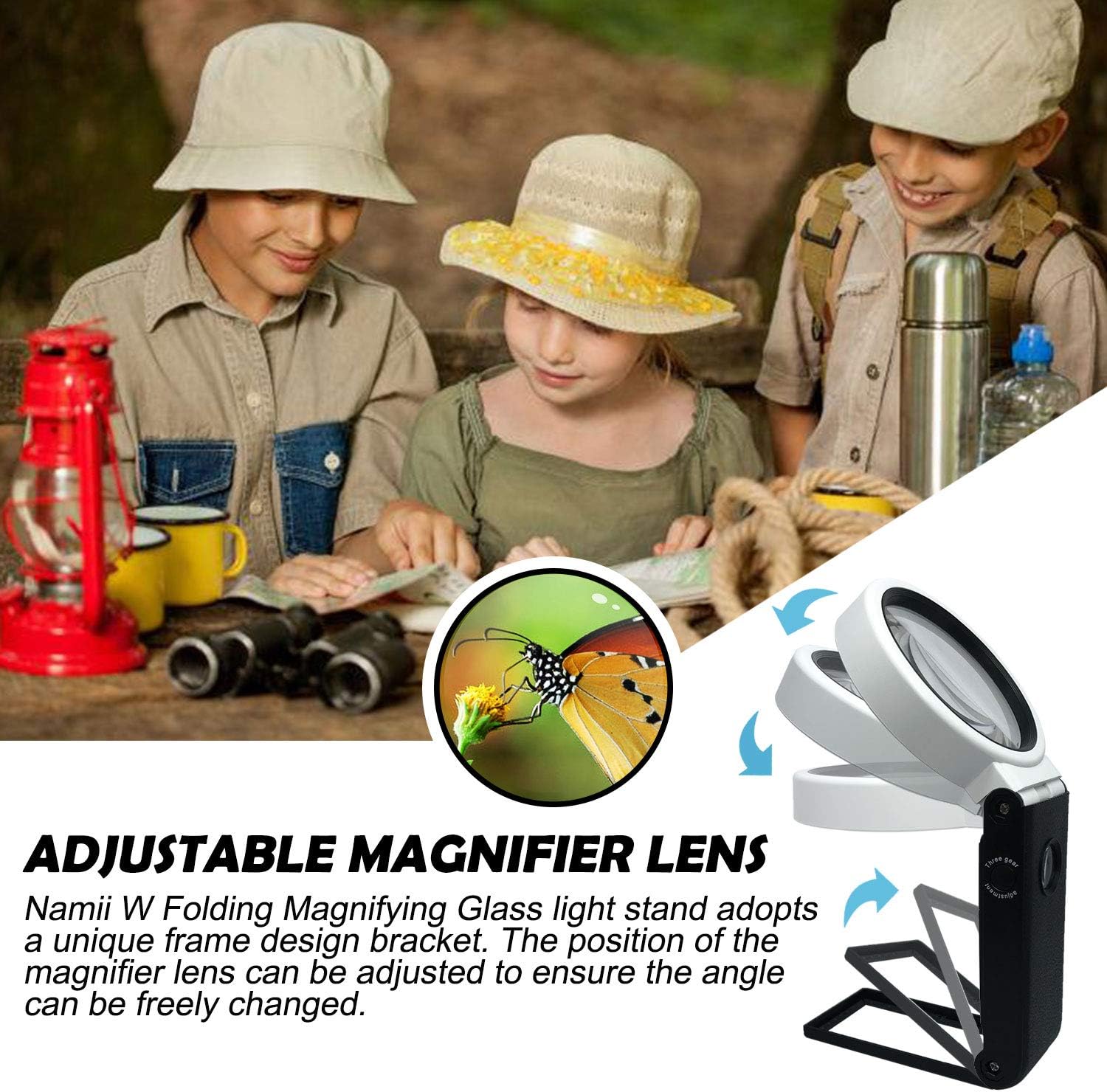 ✔ ADJUSTABLE ANGLE&LIGHTS – – Namii W Folding Magnifying Glass light stand adopts a unique frame design bracket. The position of the magnifier lens can be adjusted to ensure the angle can be freely changed. There are 3 modes lights the magnifier transforms – 5LED hands free magnifying glass – 1LED handheld high power magnifier – 2UV lights detector lamp. Our LED folding magnifying glass provide professional assist for your work, low vision seniors, job needs people and kids education.