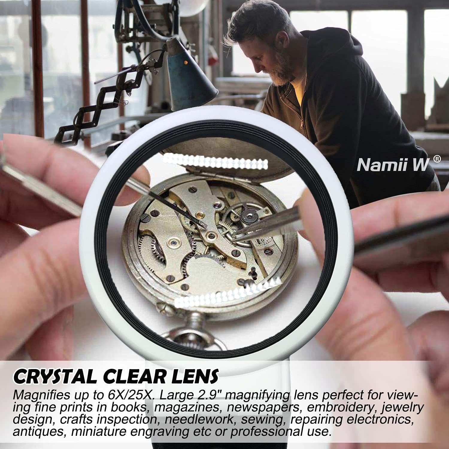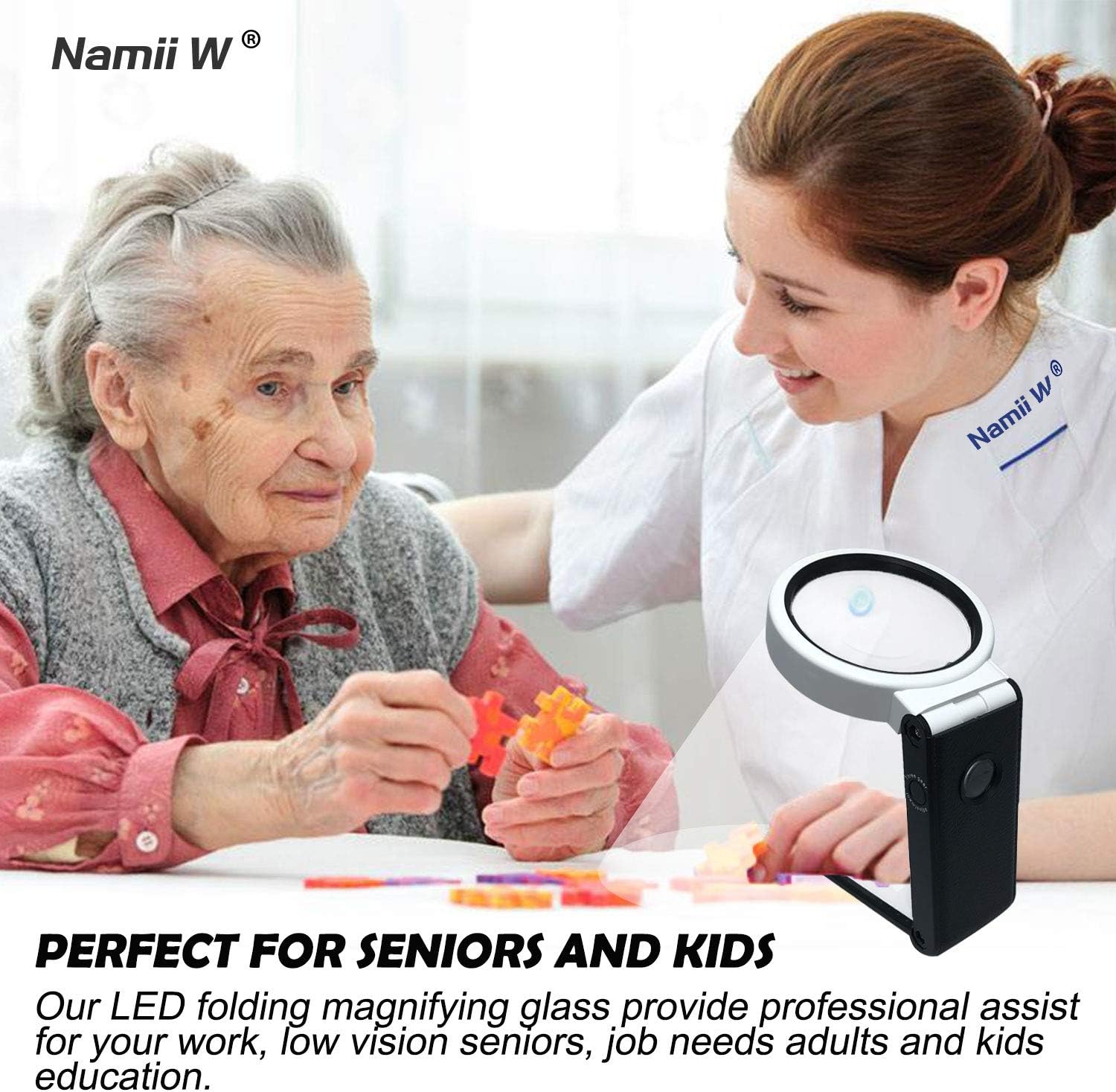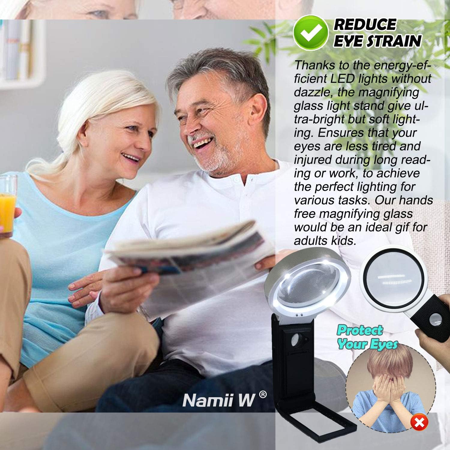 Namii W folding magnifier with light stand adopts a unique frame design bracket. The position of the magnifier lens can be adjusted to ensure the angle can be freely changed and there are 3 modes lights the magnifier transforms. Our LED magnifying glass provide professional assist for your work, low vision seniors, job needs people and kids education. Would be a great birthday,Easter, Thanksgiving, Christmas gift for seniors, kids and youth with ease,better vision better life.