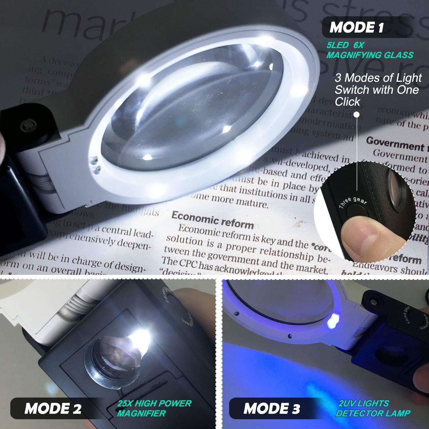 Magnifying Glass with Light and Stand Folding Design, LED Illuminated Magnifier for Close Work, Handheld Magnifying Glass for Reading, Powered by Battery or USB (6X 25X)