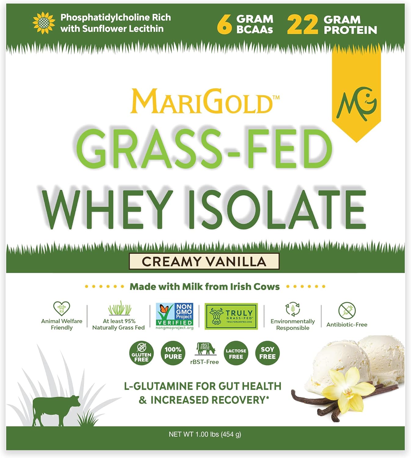MariGold Grass-fed Whey Protein Isolate Powder – Creamy Vanilla Flavor – 1 Lb Bag | 100% Pure, Cold-Processed, Micro-Filtered, Undenatured, Non-GMO, rBGH Free, Soy Free, Gluten Free, Lactose Free
