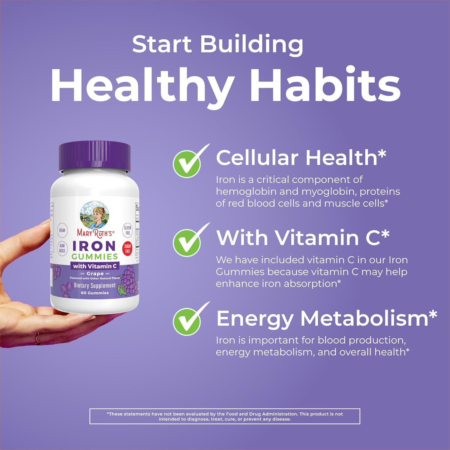 MaryRuth Organics Iron Gummies for 14+ with Vitamin C for Absorption | Sugar Free | Gummy Iron Supplement + VIT C | Energy Metabolism | Cellular Health | Immune Support | Vegan | Non-GMO | 60 Count