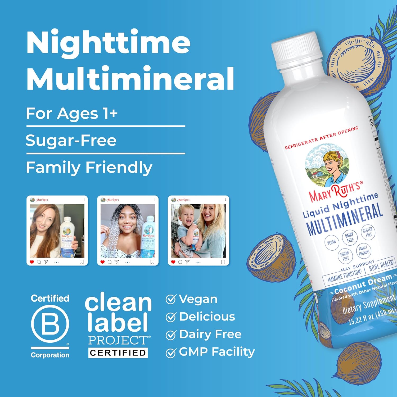For Most Lifestyles: MaryRuth’s Liquid Nighttime Multimineral is Non-GMO, Vegan, Made in a GMP Facility. Melatonin Free, Dairy Free, Gluten Free, Sugar Free. Formulated for Adults and Kids. Clean Label Project Certified. B Corp Certified.