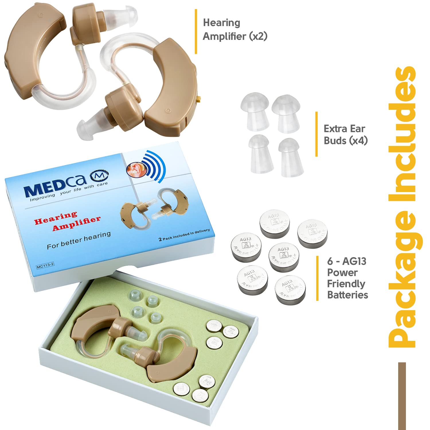 HEAR LIFE AT ITS FULLEST: Our set of 2 MEDca digital hearing amplifiers offer the best in class combination of usability, technology, and affordability that is currently available. These rechargeable hearing amplifiers will allow you to enjoy every moment with those you love! MEDca hearing amplifiers feature built-in noise reduction and a high level of flexibility that works of virtually every user to product crystal clear sound