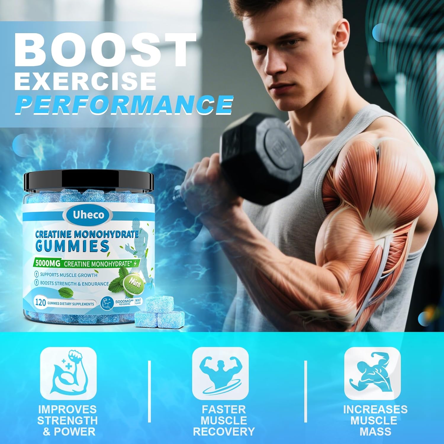 Honest and Real Creatine Content: Our gummies real contain 5000 mg of creatine monohydrate per serving. The production process of creatine monohydrate gummies is very difficult, because creatine reacts with colloidal molecules, making it impossible for them to gel smoothly, resulting in difficulty in forming the gummies. The higher the creatine content, the softer the gummies will be. Therefore, the easiest way to identify whether the creatine content of gummy candies is high or low is to observe the shape of the gummy candies. If your gummies are particularly chewy and elastic, then their creatine content must be very low. Choose Uheco to give you a real and reliable health experience.