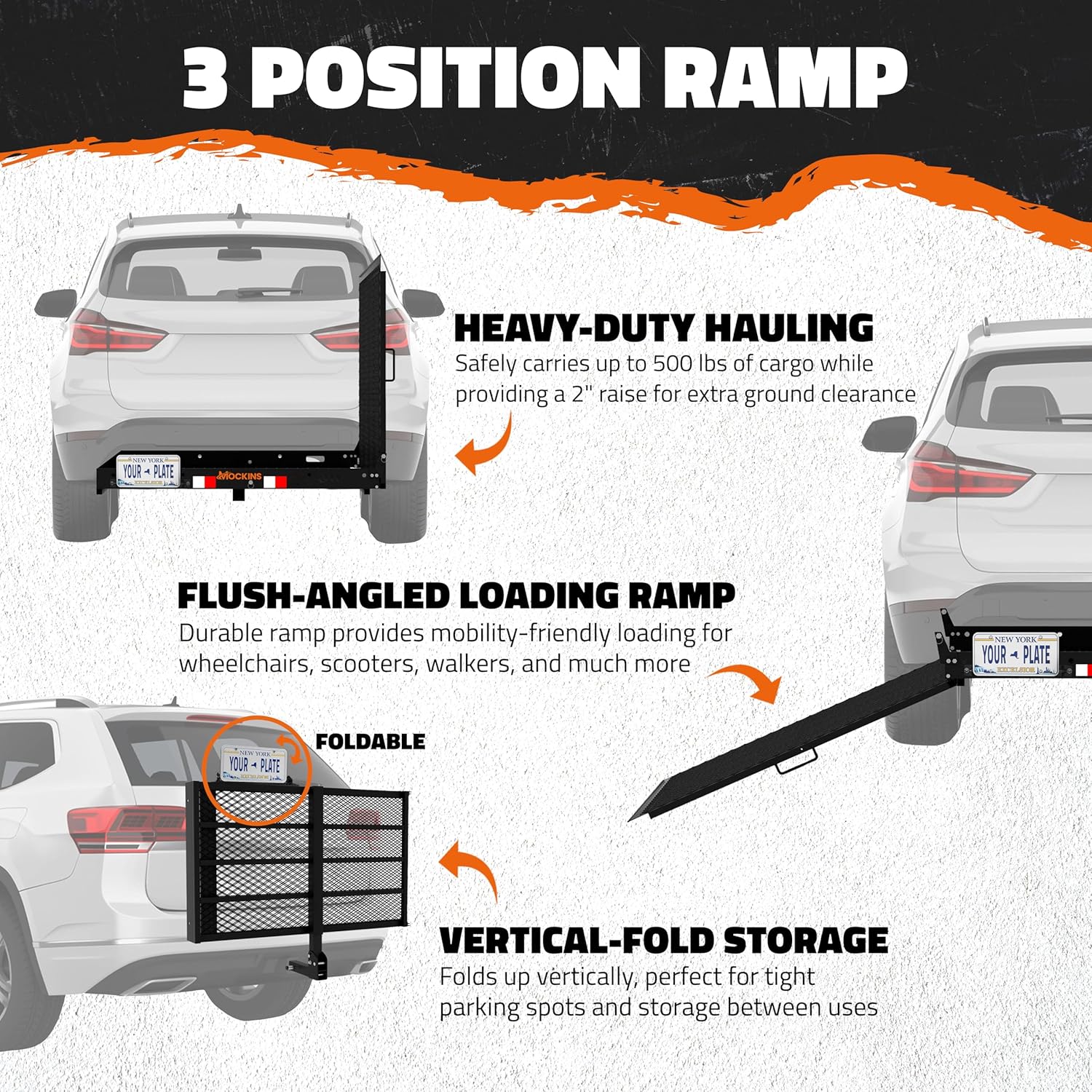 COMPLETE FOLDING HITCH CARGO CARRIER SET: Haul up to 500 lbs. with the Mockins Hitch Mounted Cargo Carrier Scooter Lift for vehicle storage, featuring a user-friendly ramp, license plate holder & reflectors for convenience & functionality. The hitch cargo carrier with bike rack 3-position ramp fastens down cargo using 4 strong loop straps & 4 ratchet straps. Minimize sway & maintain security with the hitch stabilizer & hitch lock. Haul efficiently with the Mockins Wheelchair Lift for SUV & Car.