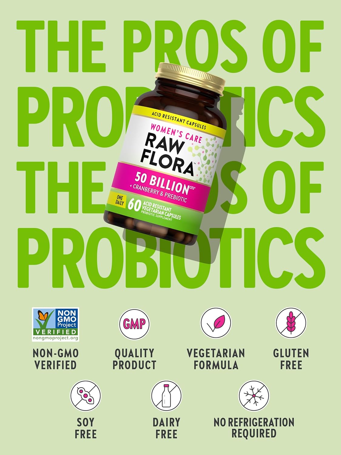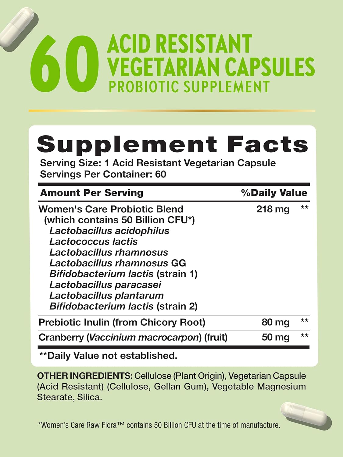 Nature’s Truth Raw Flora Probiotics for Women | 50 Billion CFU | 60 Capsules | with Cranberry & Prebiotic | Vegetarian & Gluten Free Vitamins