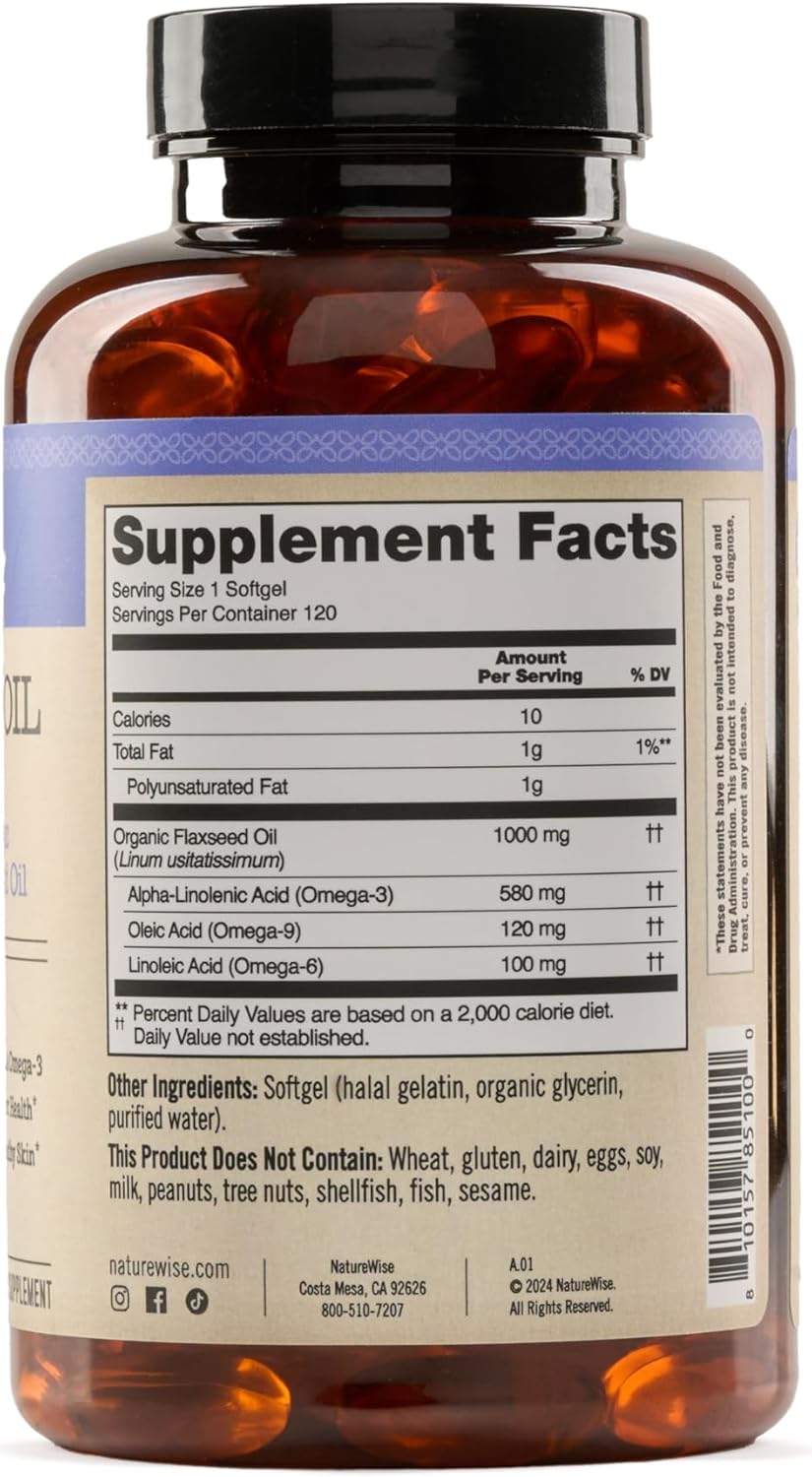 HIGH-POTENCY ALA OMEGA-3: NatureWise Organic Flaxseed Oil delivers 580mg of high-potency ALA Omega-3 essential fatty acids, as well as 100mg of linoleic acid for omega-6 and 120mg of oleic acid for omega-9.