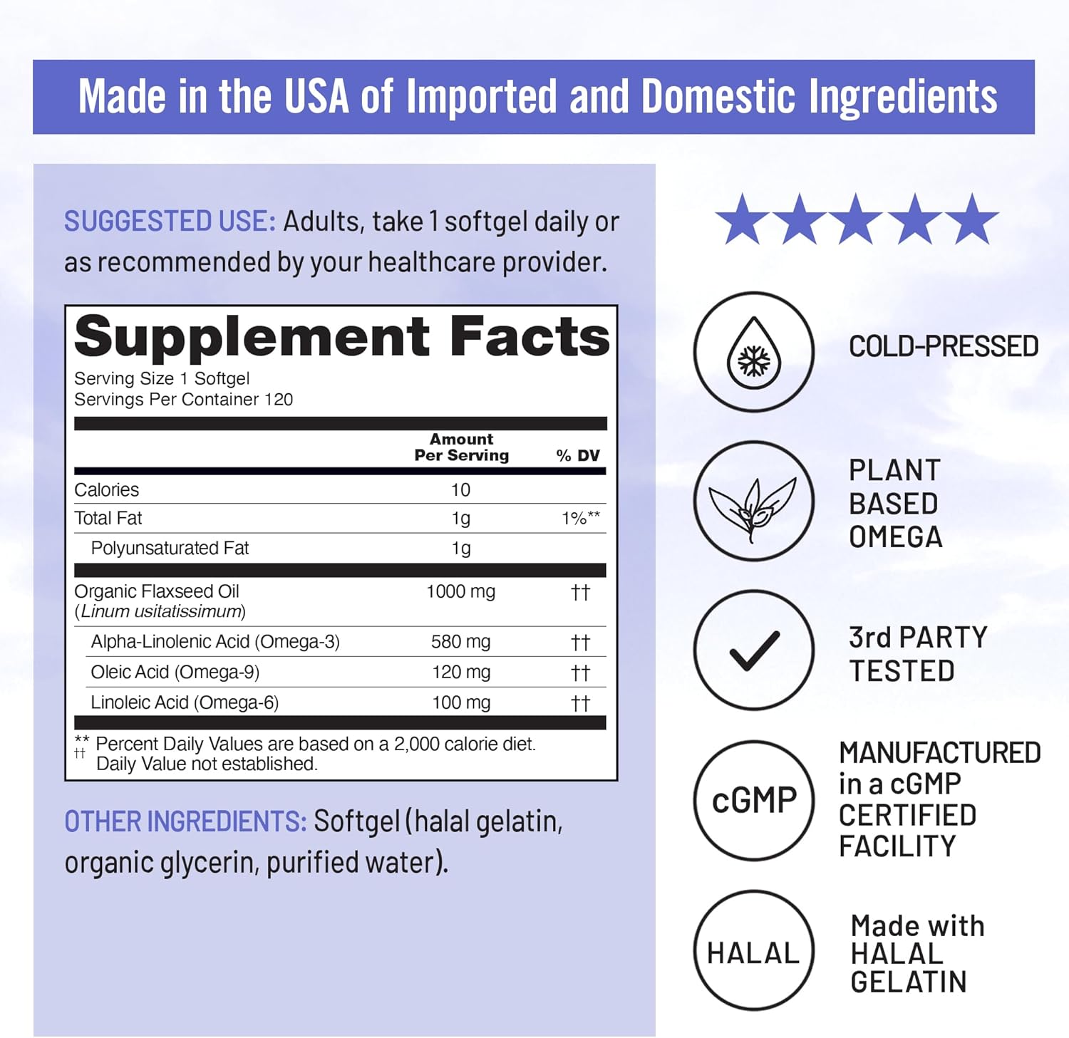 NON-GMO, MADE WITH HALAL GELATIN: Flaxseed oil offers a cleaner, more sustainable, non-GMO plant-based omega-3 essential fatty acids than fish oil supplements. Our softgels are made with bovine-derived, halal gelatin.