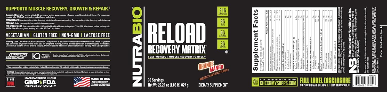 NutraBio Reload – Powerful Muscular Recovery Formula – Post-Workout Supplement – 3G Creatine – 8G BCAAs – 5G Glutamine – 30 Servings, Orange Mango