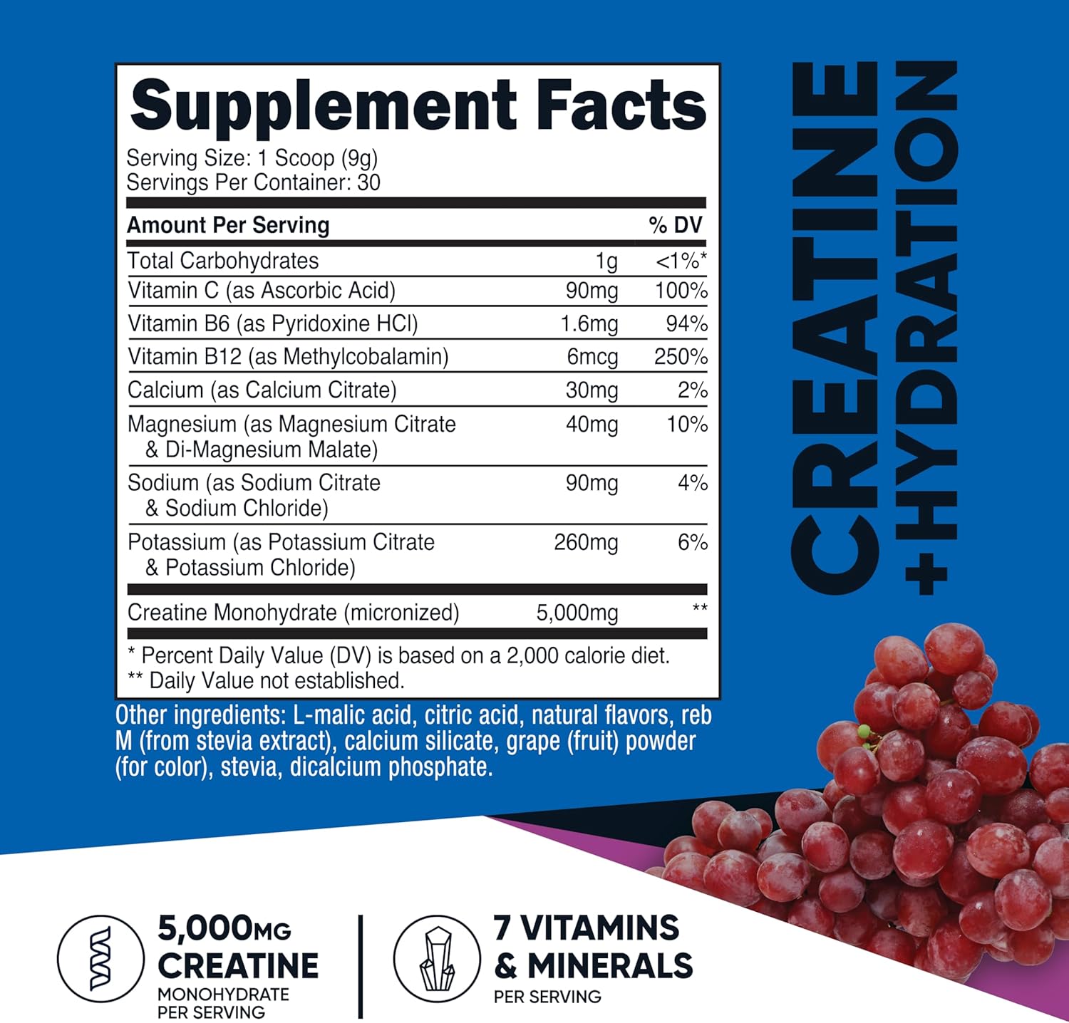Nutricost Creatine Monohydrate + Hydration Grape Flavored (30 Servings) – 7 Vitamins & Minerals, 5000mg of Creatine Per Serving