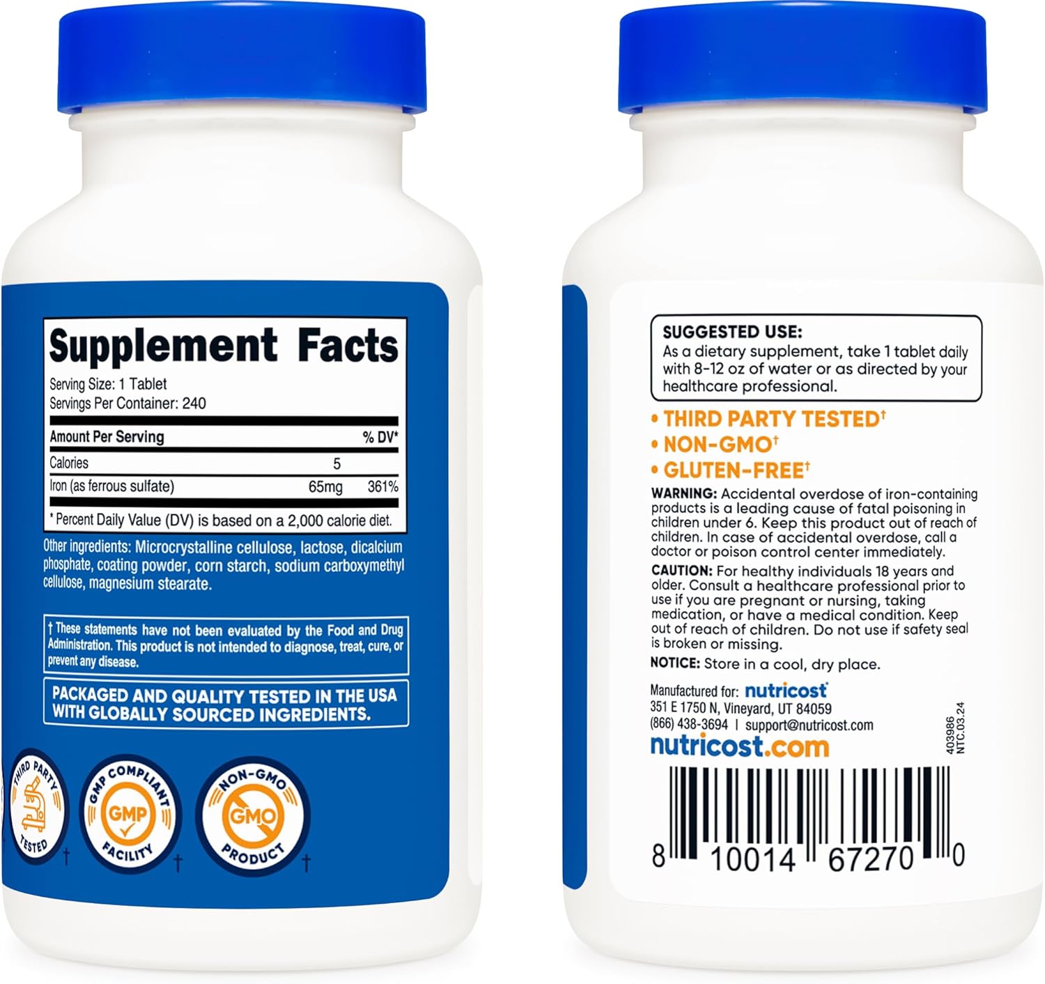 Nutricost Iron (As Ferrous Sulfate) 65mg, 240 Tablets – Non-GMO, Gluten Free