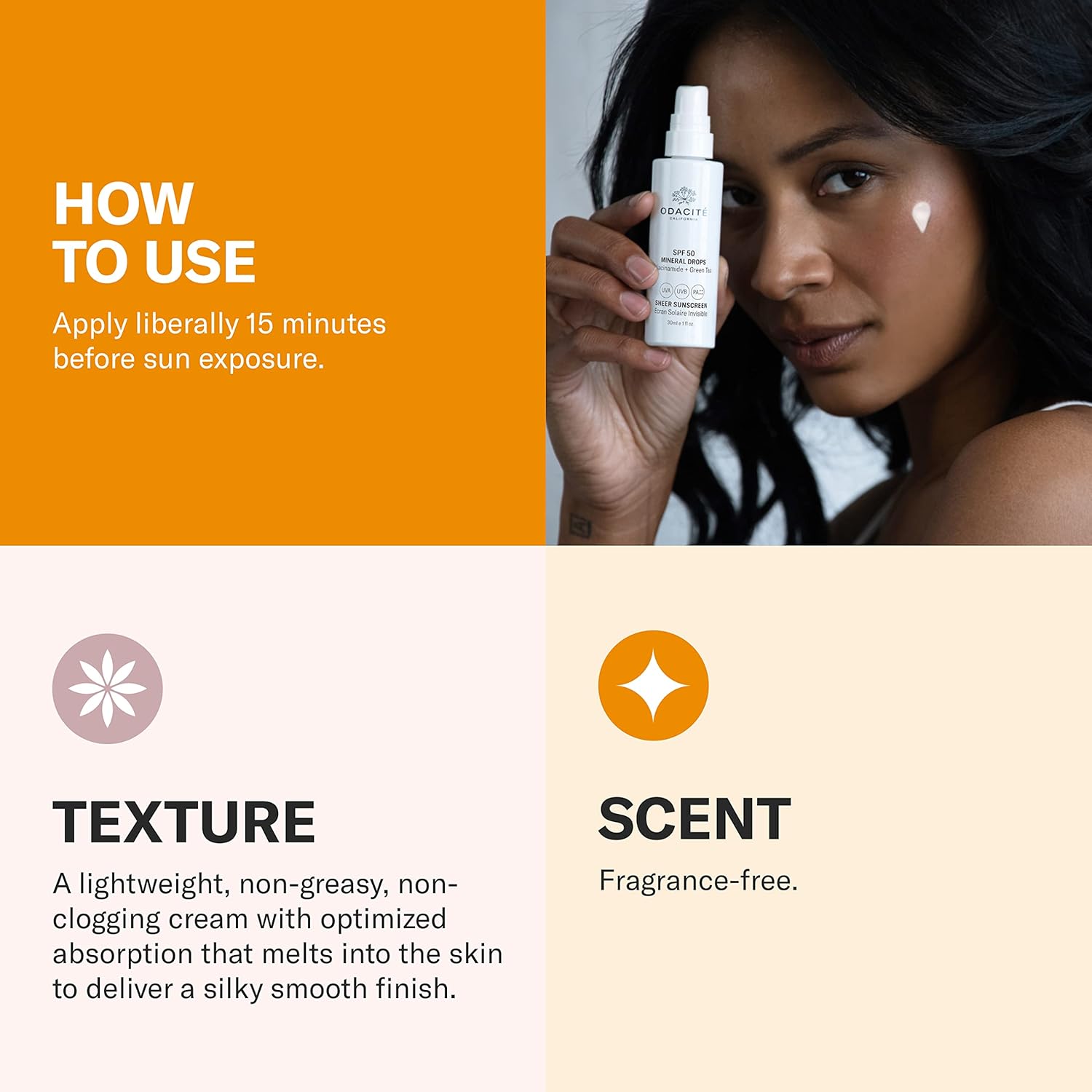 Powered by Anti-Aging Sun Protection and Our Antioxidant-Rich Sun Repair Complex: Odacité Mineral Drops SPF 50 Sheer Sunscreen is an invisible UVA/UVB anti-aging mineral sunscreen that ensures high broad-spectrum protection and skin-perfecting benefits with a UVA protection rating of PA++++. 1-fl-oz bottle.