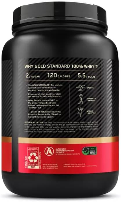 Optimum-Nutrition Gold Standard 100% Whey Protein Powder 23.59oz Protein Supplement 24g Protein per Serving 5.5g BCAAs Post Workout Easy Mix Muscle Recovery Anytime Formula Gluten Free Tubs!