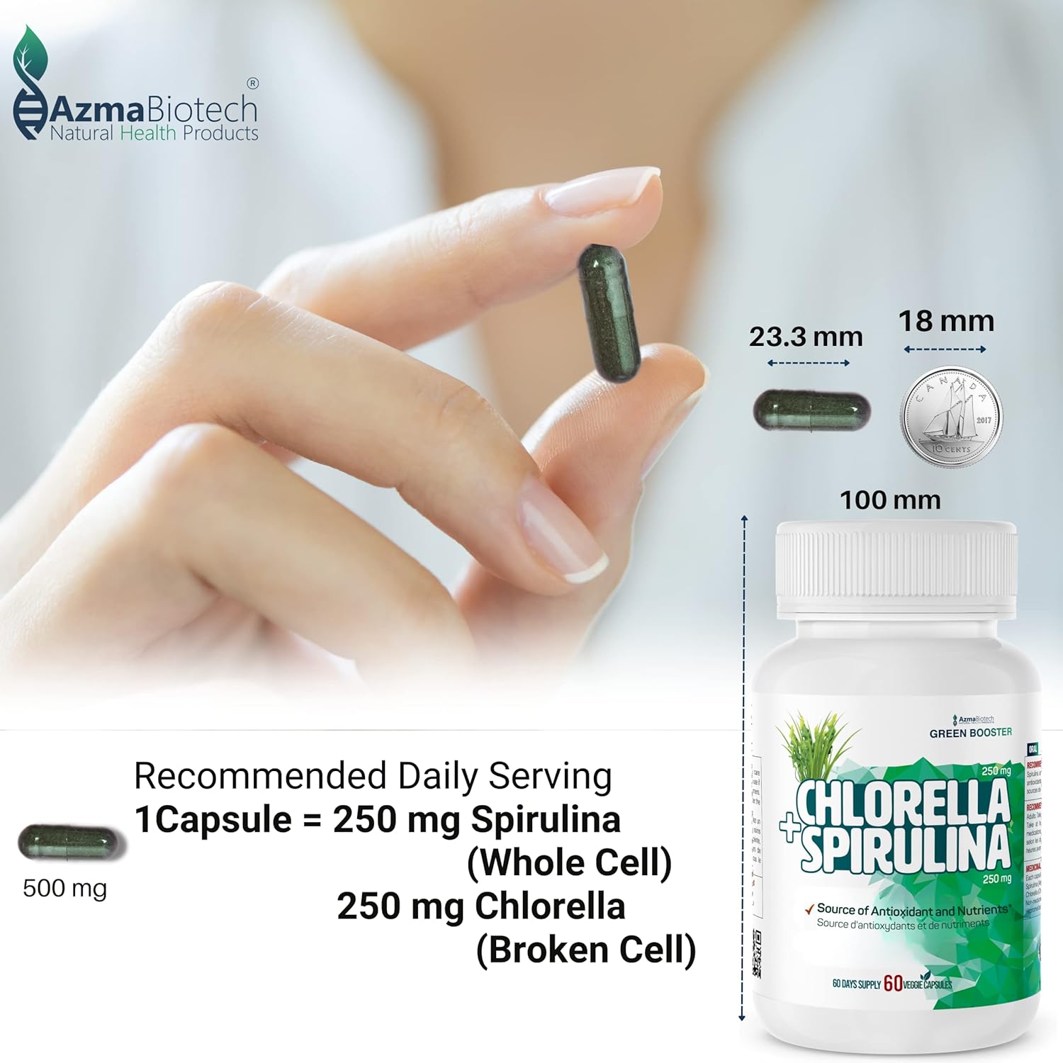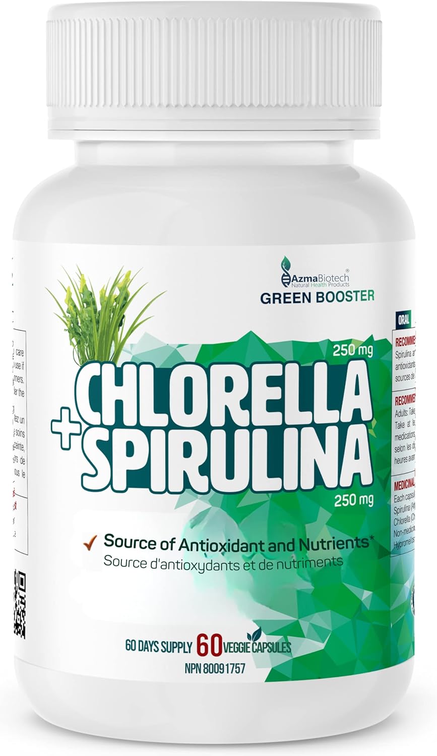 Support your daily wellness routine with a balanced blend of natural superfoods. AzmaBiotech Chlorella and Spirulina capsules provide a total of 500 mg per serving, combining 250 mg of Spirulina (Arthrospira platensis) and 250 mg of Chlorella (Broken Cell). This formula is designed to deliver essential nutrients and antioxidants from two of the most nutrient-dense algae sources. Chlorella and Spirulina are rich in vitamins, minerals, and antioxidants, making them ideal for those seeking plant-based support for energy, detox, and immune health. The broken cell form of Chlorella enhances nutrient absorption, while Spirulina offers natural support for vitality and daily energy. Each bottle contains 60 easy-to-swallow veggie capsules, providing a full 60-day supply with a recommended dosage of one capsule per day. Key Features 500 mg per capsule: 250 mg Spirulina and 250 mg Chlorella 60 veggie capsules per bottle (60-day supply) Plant-based and vegan formula No gluten, soy, dairy, or common allergens Non-GMO ingredients Made in Canada in a GMP-certified facility Third-party tested for purity and quality Suggested Use Adults: Take one capsule daily with food or as directed by a healthcare professional. Do not exceed the recommended dose.