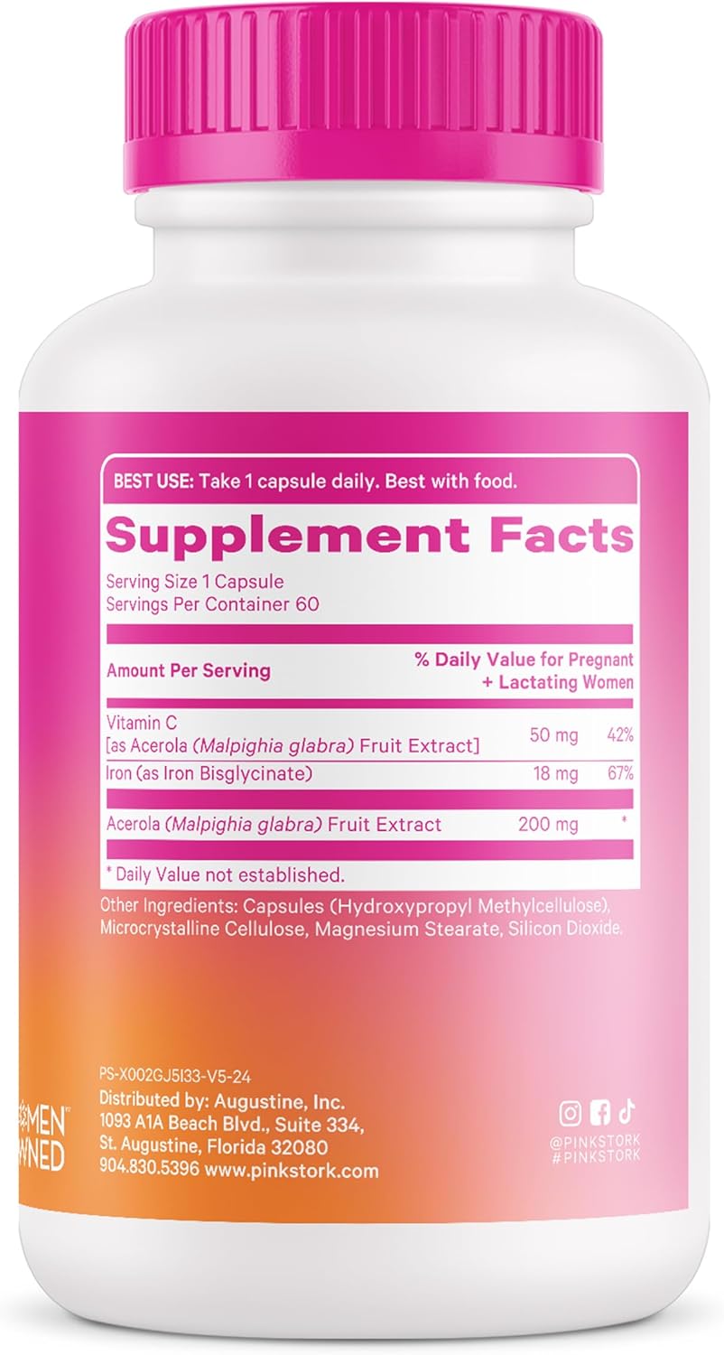 Pink Stork Prenatal Iron Supplement for Women – 18 mg Non-Constipating Iron & Vitamin C for Pregnancy, Postpartum, & Breastfeeding – Focus, Fatigue, & Blood Cell Production – 2 Month Supply