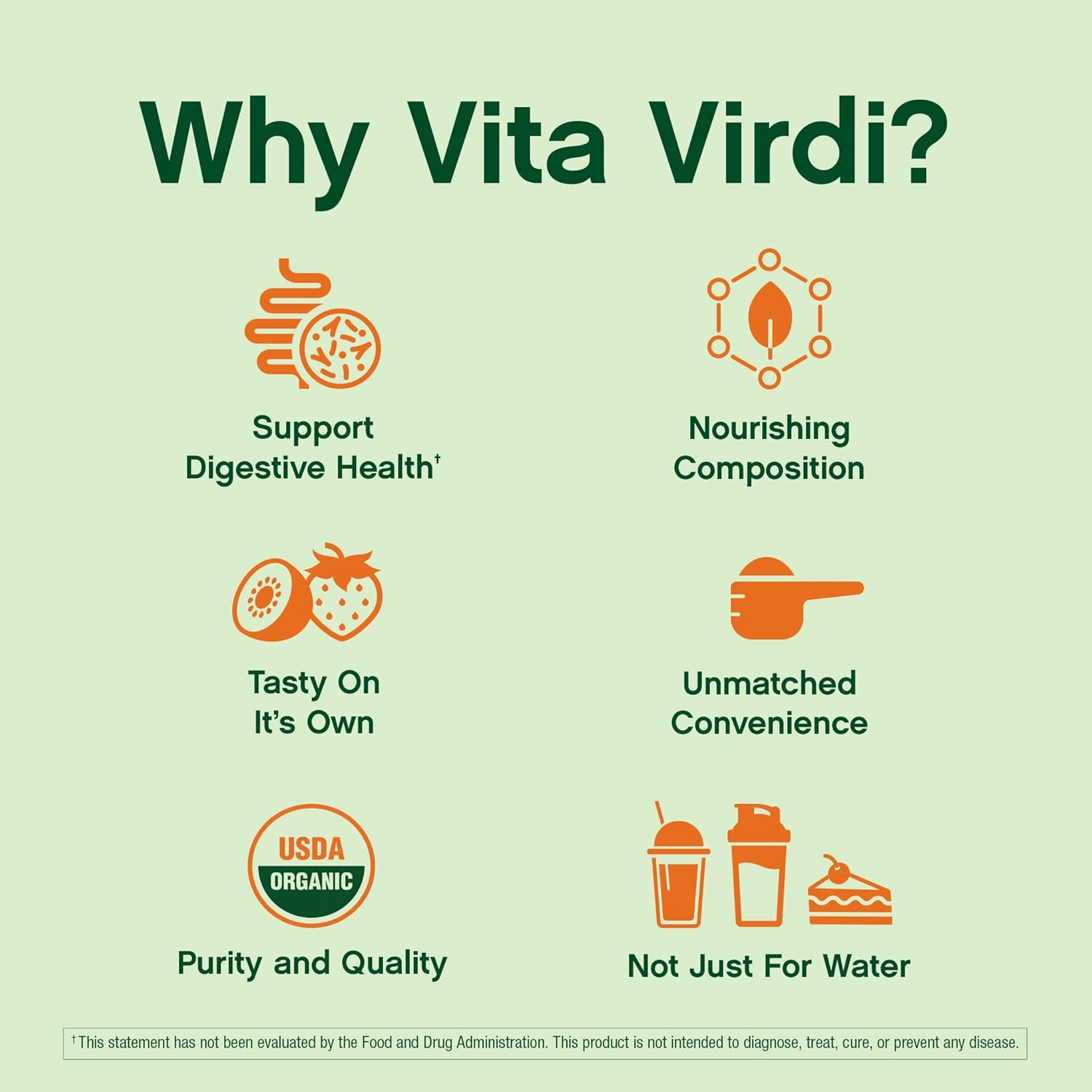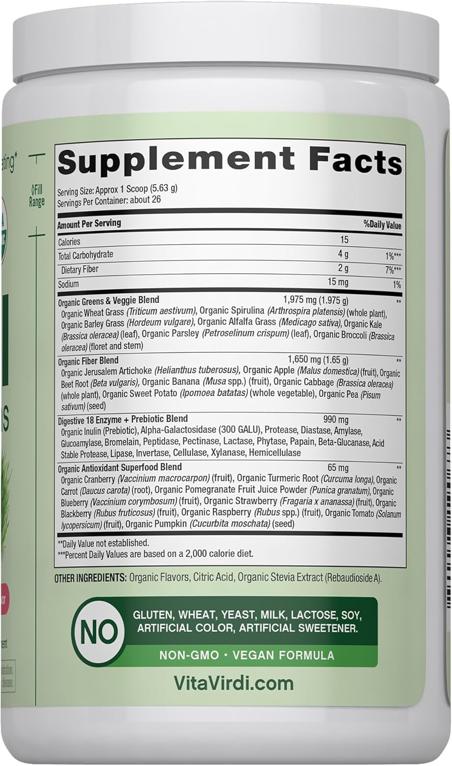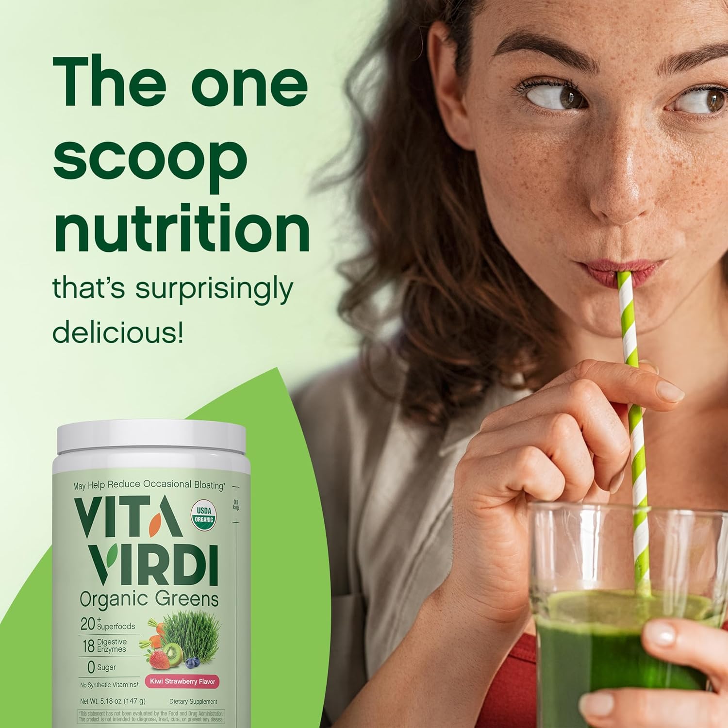Piping Rock Vita Virdi Organic Greens | 20+ Superfoods & 18 Digestive Enzymes | 1-Month Supply | 0g Sugar | Kiwi Strawberry | USDA Organic, Non-GMO, Vegan | Daily Wellness & Nutrition Supplement