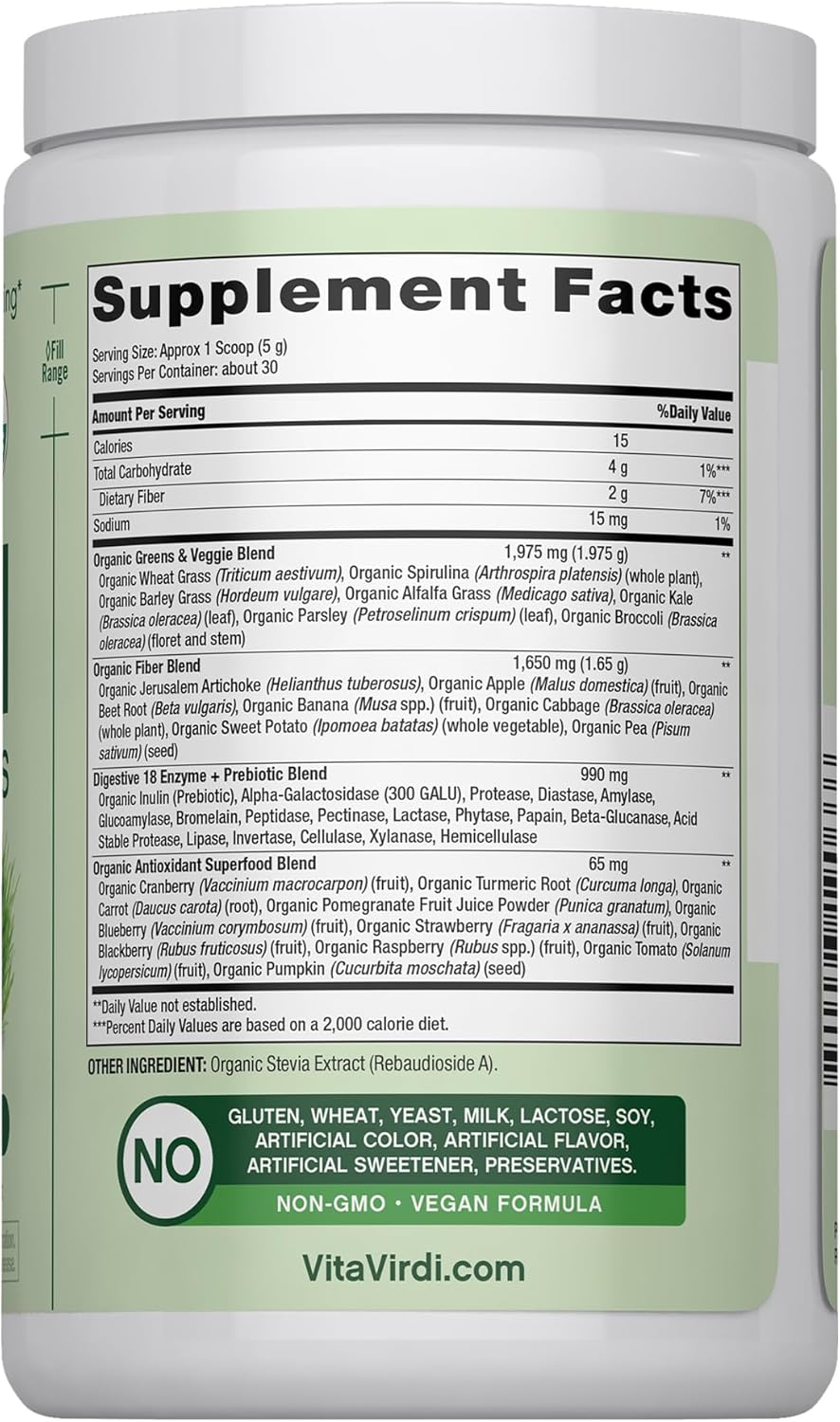 Piping Rock Vita Virdi Organic Greens | 20+ Superfoods & 18 Digestive Enzymes | 1-Month Supply | 0g Sugar | Unflavored | USDA Organic, Non-GMO, Vegan | Daily Wellness & Nutrition Supplement