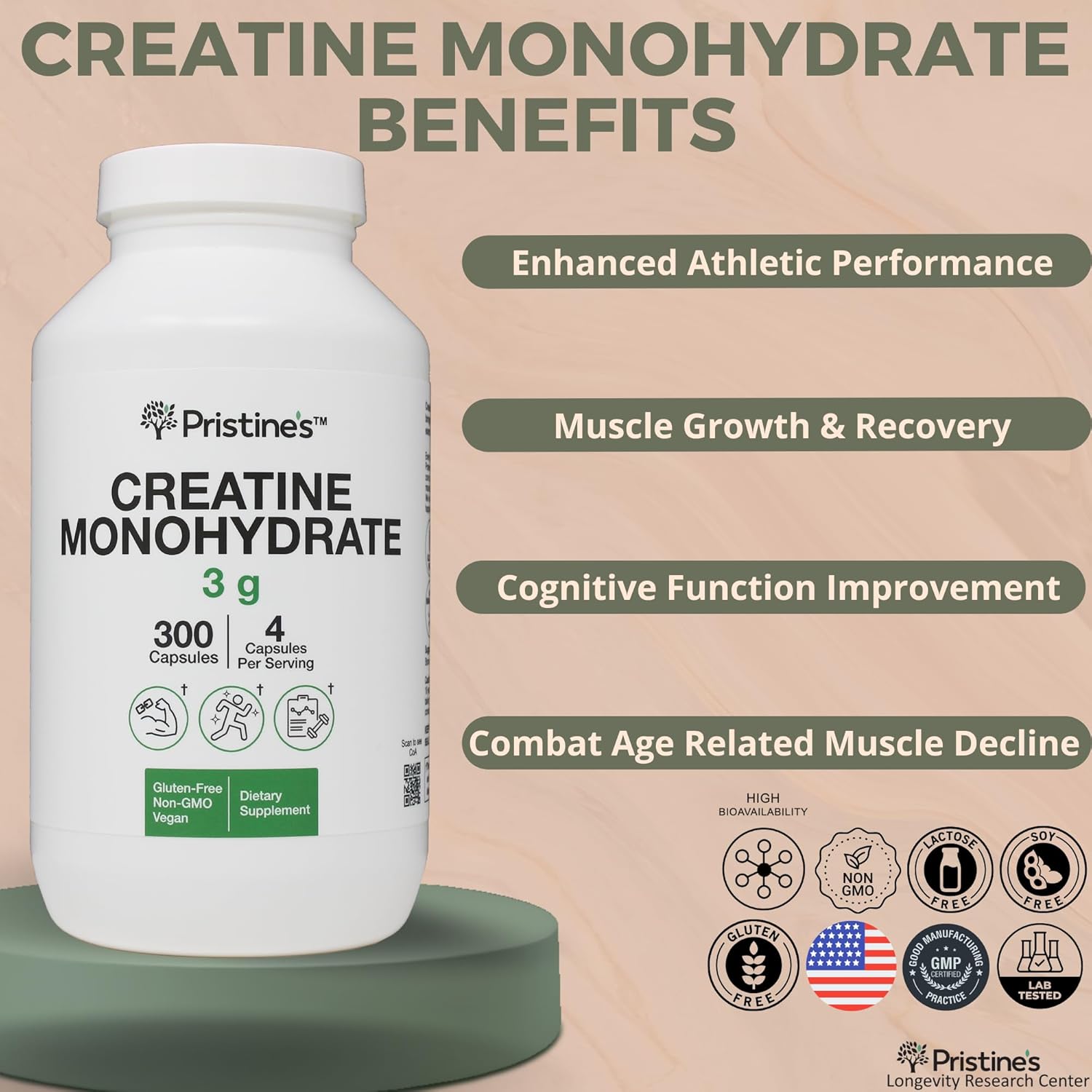 PRISTINE’S Creatine Monohydrate Capsules for Women & Men – No Bloat 75 Day Supply 3G Muscle Growth Support Supplement – Cognitive & Athletic Performance Support – Enhanced Recovery