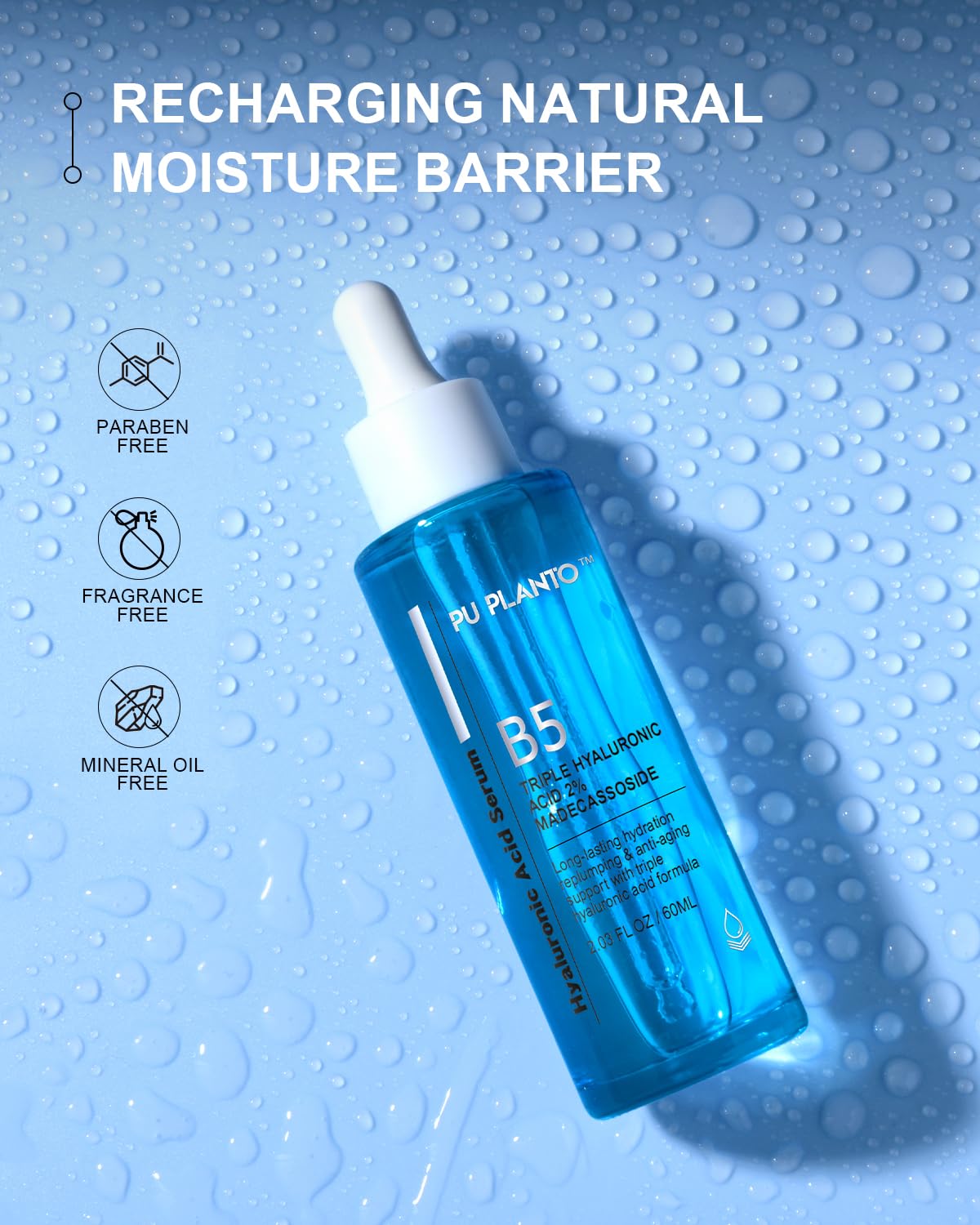 TRIPLE HYALURONIC ACID: Formulated 1% low molecular, 0.8% medium, and 0.2% high Hyalu Acid, this face serum offers multi-level hydrates and plumps, also with Panthenol (Vitamin B5) and Madecassoside, provides long-lasting hydration and smoothing skin