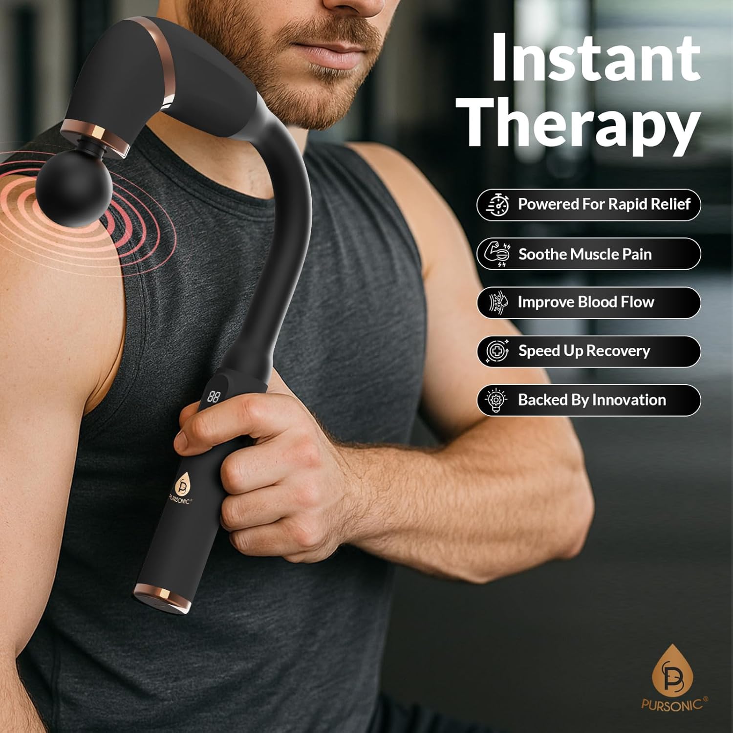 Pursonic Deep Tissue Massage Gun with U-Shaped Design & Long Handle – Handheld Back Massager with 4 Heads, 6 Speeds, USB-C Rechargeable for Neck, Shoulders, Legs & Muscles