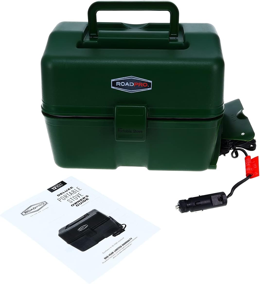 This portable stove and 12-volt food warmer is a must for your camping trips and tailgating or for truckers and travelers. This deluxe-model lunchbox heater safely plugs directly into your 12-volt power port or cigarette lighter to warm leftover food. You will be able to cook food to a surface temperature of 300 degrees while on the go. Great for steaming foods too such as rice or vegetables. Save money while traveling by cooking your own meals using power from your vehicle battery. Use with the RoadPro 8 in. x 3.75 in. x 2.5 in. aluminum disposable pans (model RPSC-90820) to make clean-up quick and easy. This portable food warmer lunch box conforms to UL1026 safety standards. Simply plug the portable stove-lunchbox oven into the vehicle cigarette socket for convenient and healthy meals while on the road. Looks and feels like a work lunchbox with a handle for easy transport to and from your destination and a latch to keep your meal secure inside this 12v traveling stove. For use with a 12 volt power port rated at 15 amps, (180 watts) or more.
