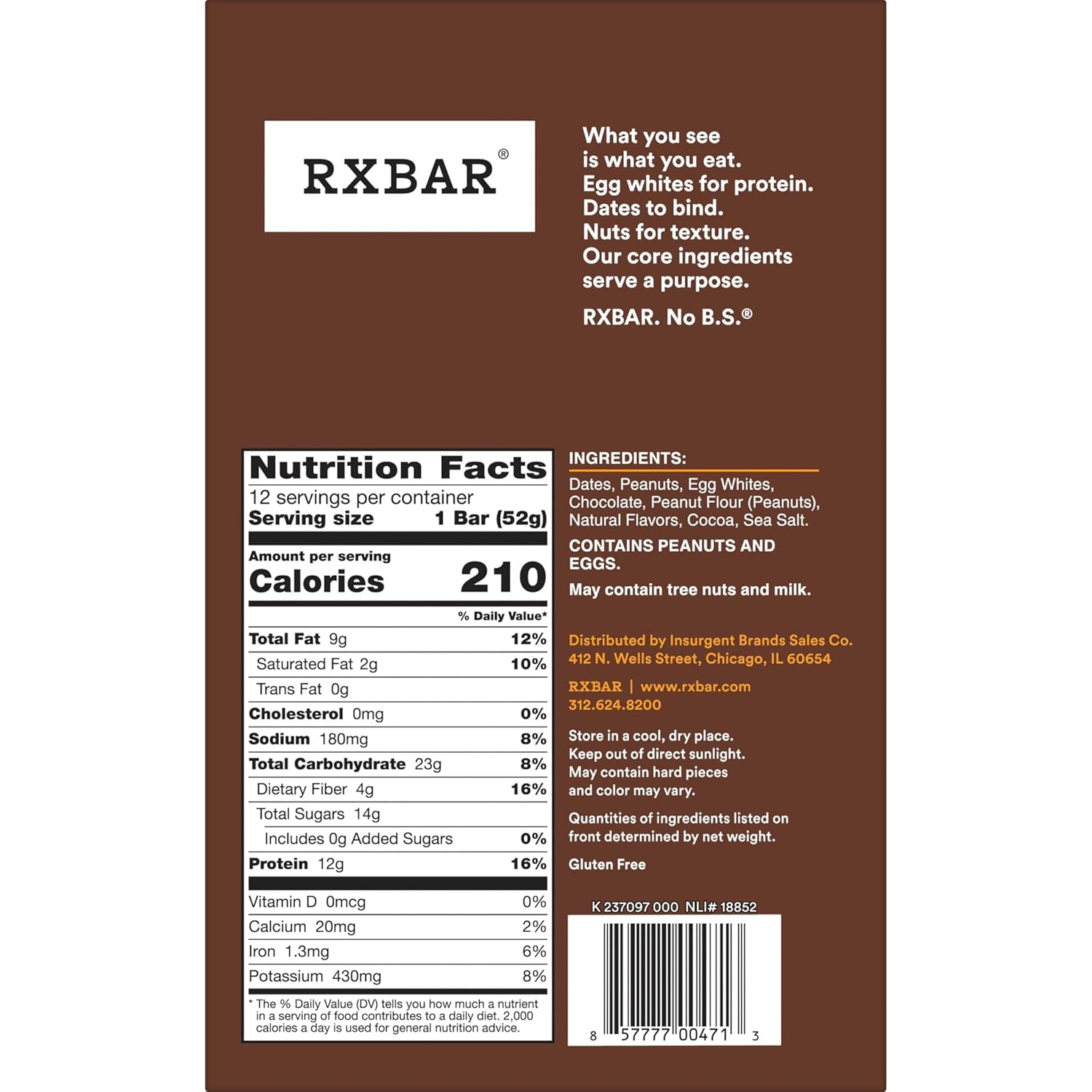 Includes 1, 22oz box containing 12 RXBAR Peanut Butter Chocolate protein bars