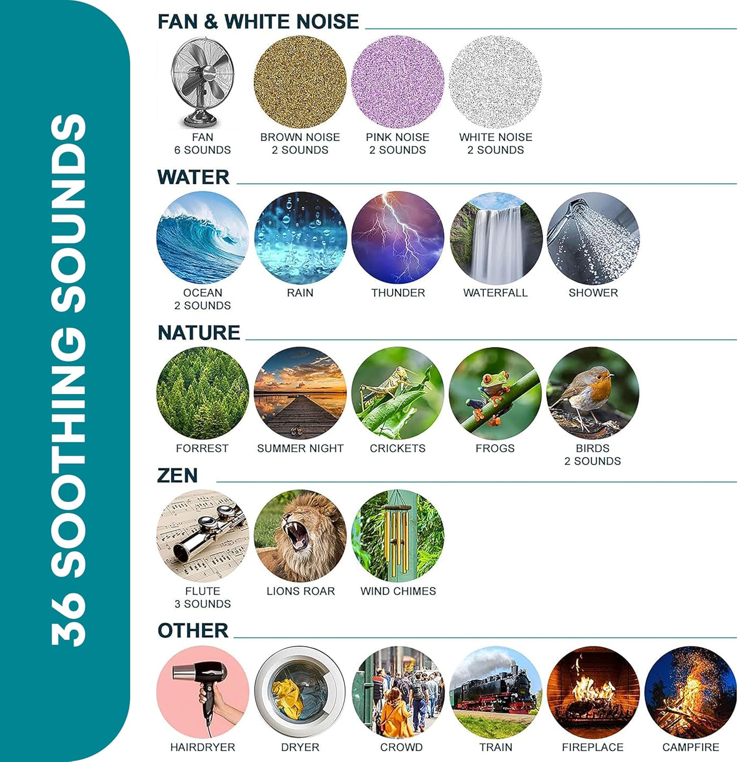Diverse Sound Library: Includes 36 soothing sounds, from fan sounds to rain and nature sounds; sound machine options include white noise, ocean waves, thunder, birds, forest, and more