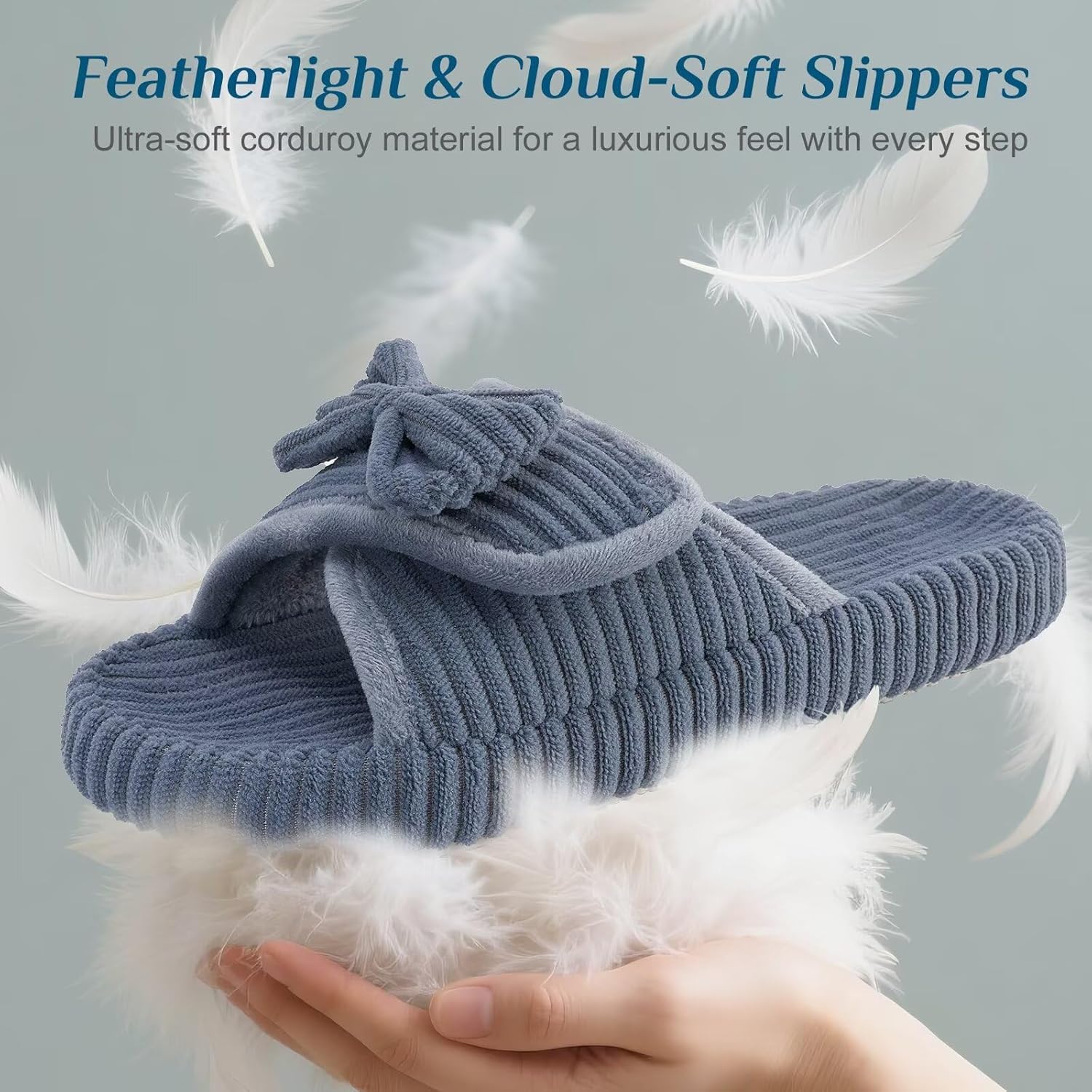 Slippers for Women Corduroy House Bedroom Slippers with Arch Support Adjustable Bow Open Toe Womens Slides for Orthopedic & Plantar Fasciitis 5-12