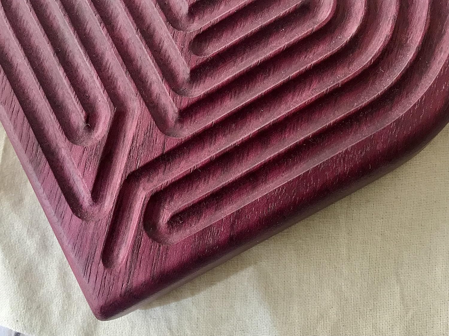 This small finger labyrinth is of purpleheart wood, giving it a striking color. It is 5 inches high and 5 inches wide and is approximately 3/4 inch thick. It is hand finished with beeswax and jojoba oil – we make this natural finish ourselves, so you be assured there are no unexpected additives. Each labyrinth is carefully hand-finished to ensure all edges are smooth.