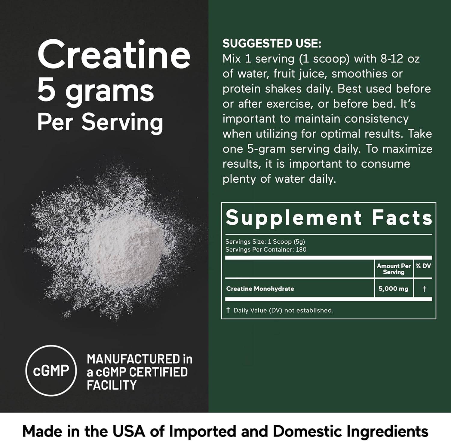 3rd PARTY TESTED, PREMIUM QUALITY: Smarter Nutrition Creatine Monohydrate Powder contains 5 grams (5000 mg) of quality creatine monohydrate per scoop and is manufactured in the USA of domestic and/or imported ingredients in a cGMP-certified facility with third-party quality control audits