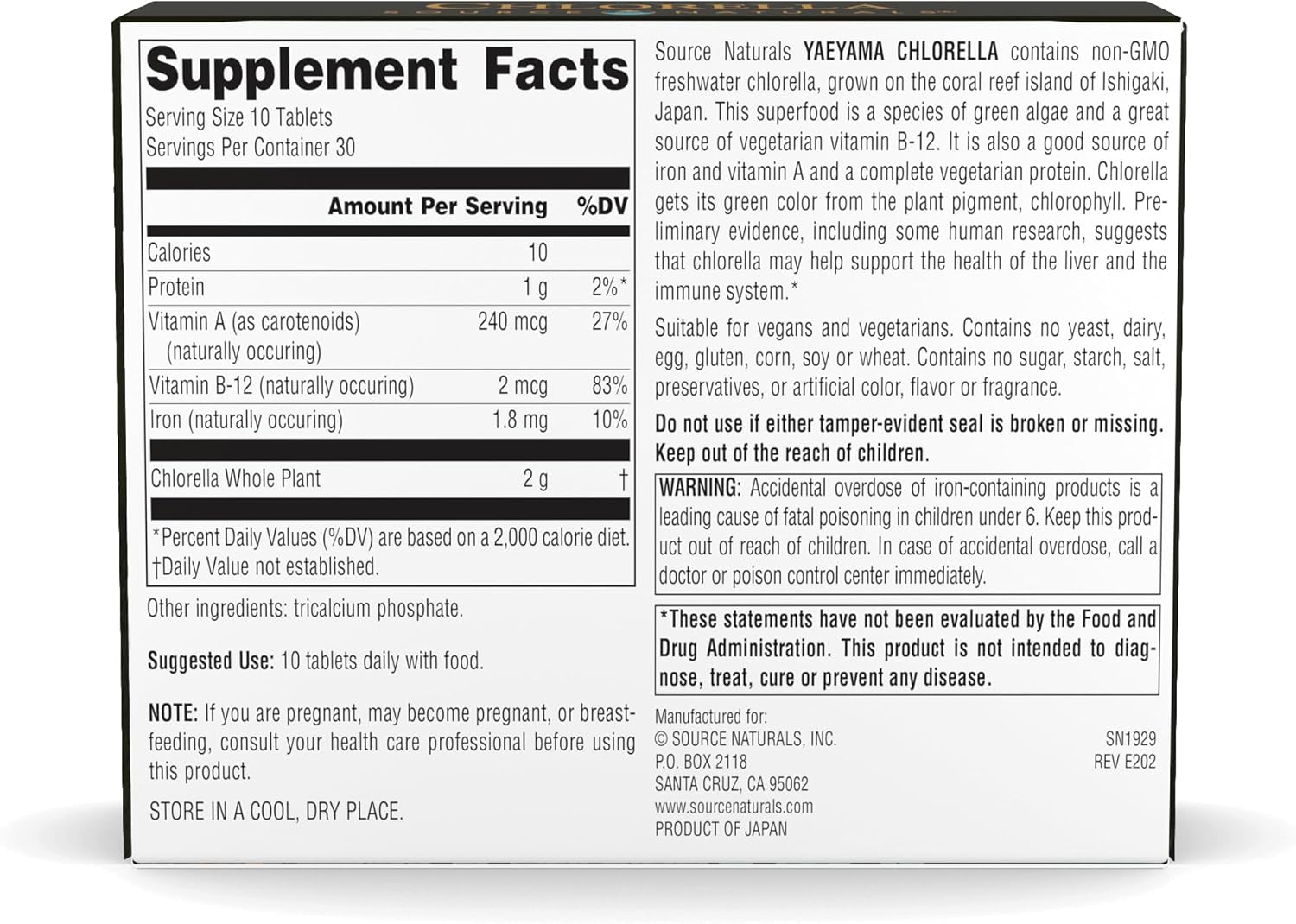 Source Naturals Yaeyama Chlorella Box 200 mg Freshwater Green Superfood, Plant-Based B12-300 Tablets