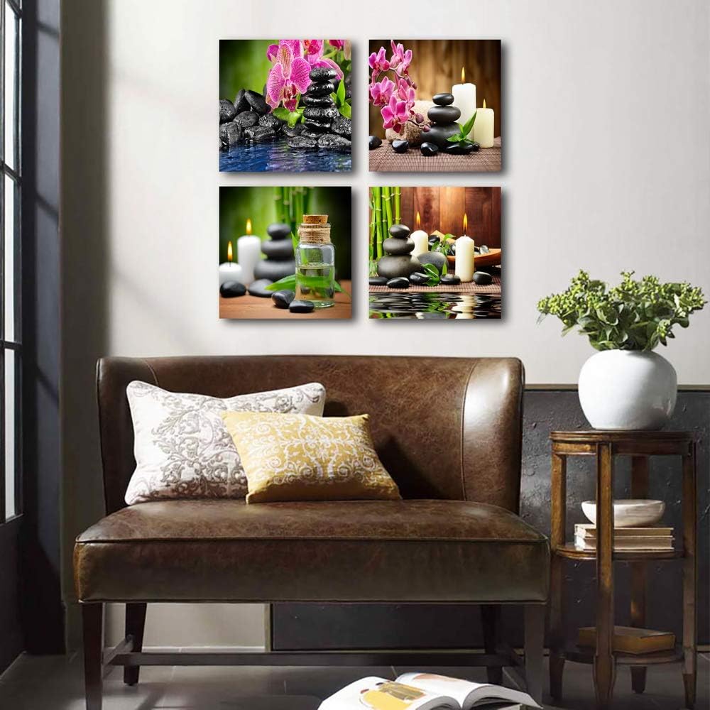 Spa Bathroom Decor Stone Wall Panels, Zen Wall Art for Yoga Meditation Calming and Relaxing, Bamboo Candle Phalaenopsis and Stone Pictures for Office Bedroom Living Room (12x12in, 4 Panels)