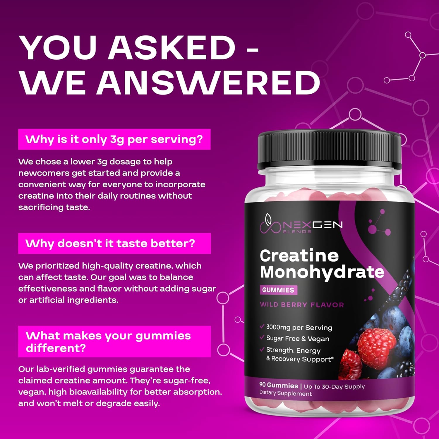 The NexGen Difference – Say hello to our tasty gummy creatine flavored like berries without any added sugar or artificial flavors and colors plus these creatine chewables are rigorously lab tested