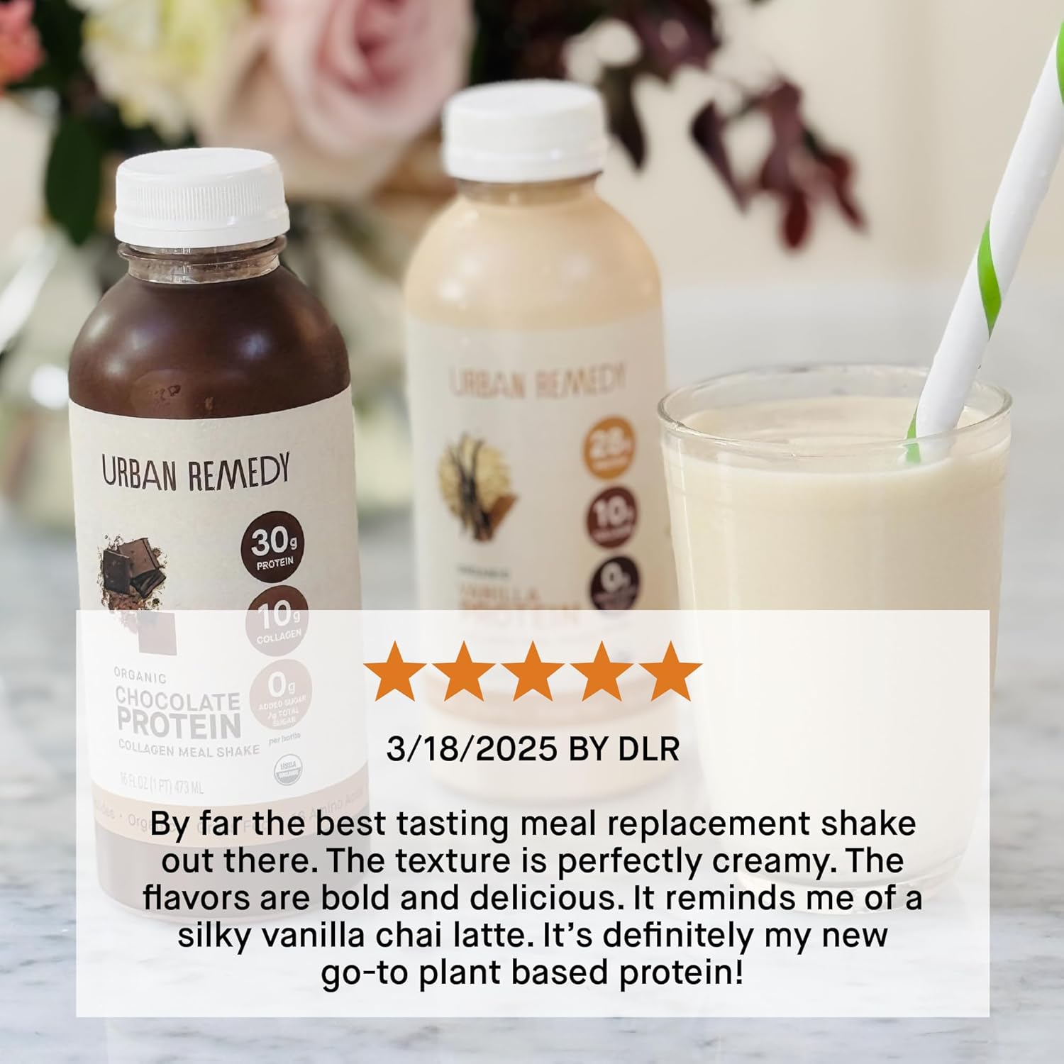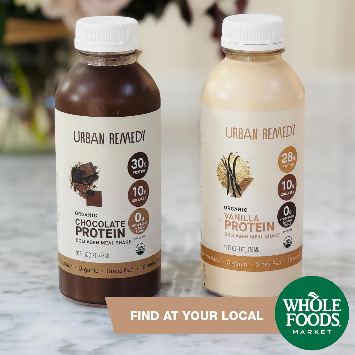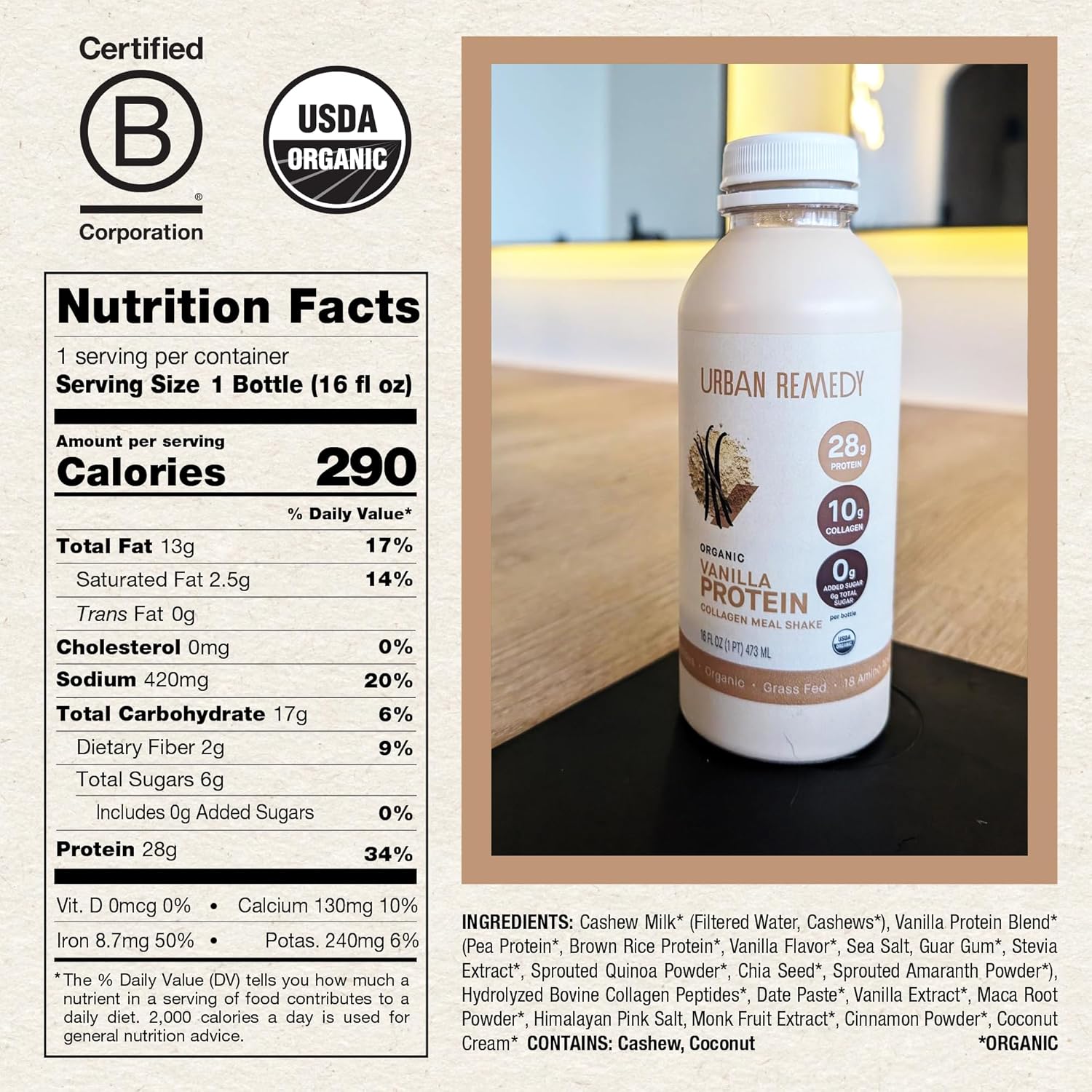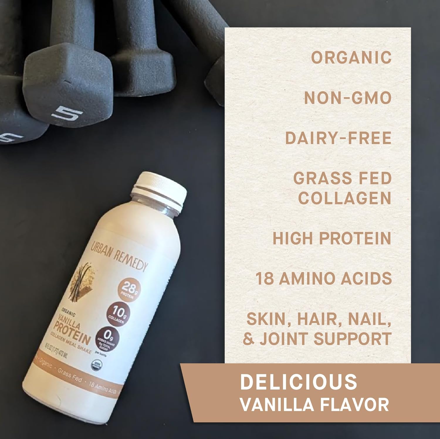 Urban Remedy Vanilla Protein Collagen Meal Shake, 16 oz – 28g Protein, 10g Organic Grass-Fed Collagen, No Added Sugar, Dairy-Free