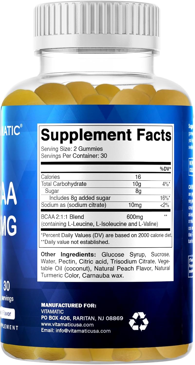 Vitamatic BCAA Gummies – Branch Chain Amino Acid Supplements – Peach Flavor – 600mg per Serving – 60 Vegan Pectin Based Gummies (1 Bottle)